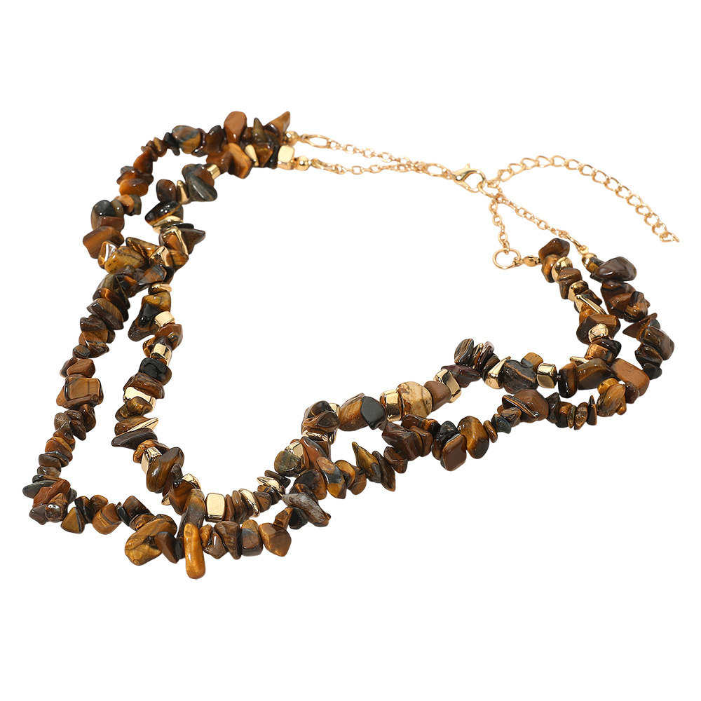 • Layered chip bead necklace featuring irregular natural stone pieces and metallic accents. Designed with an adjustable clasp, this bold statement piece adds earthy elegance and texture to both casual and dressy outfits.