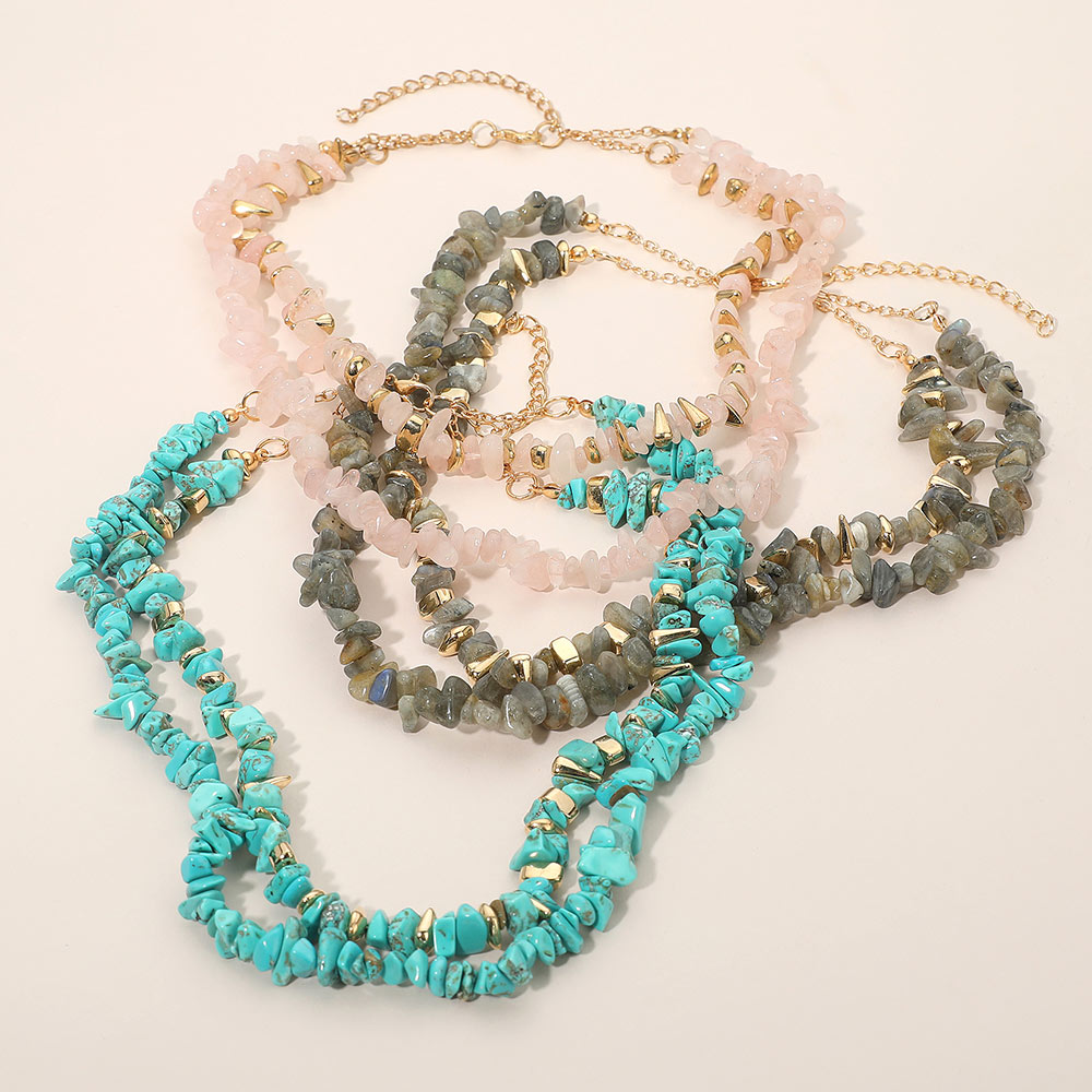 • Layered chip bead necklace featuring irregular natural stone pieces and metallic accents. Designed with an adjustable clasp, this bold statement piece adds earthy elegance and texture to both casual and dressy outfits.