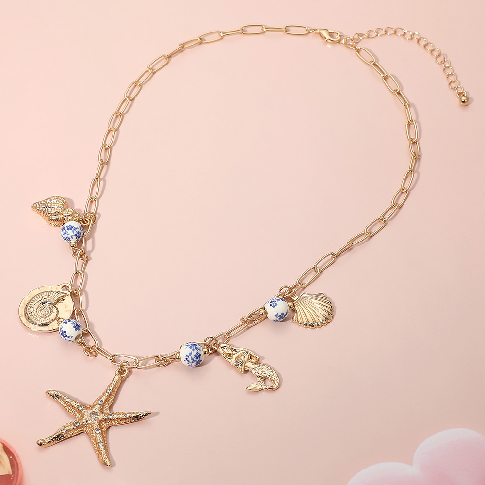 Details • Necklace Size : 18" + 3.25" L • Decor Size : 1.7" L • Stylish chain necklace decorated with starfish, seashell, mermaid, and ocean-inspired charms, accented with beaded details. A playful yet elegant accessory perfect for summer, beach outings, and seaside-inspired looks, adding a unique nautical touch to casual and vacation outfits. • Gold Dipped • Made In Korea