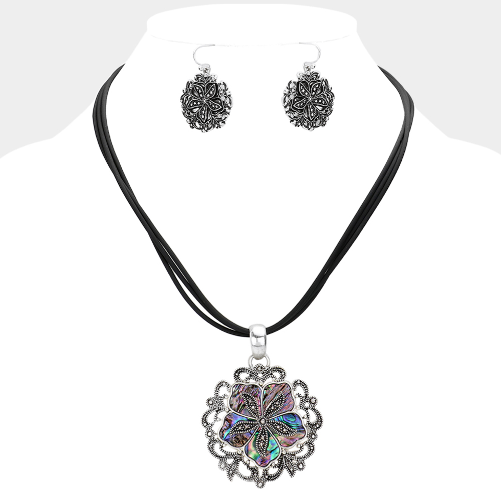 Abalone Flower Accented Brass Metal Leaf Dangle Earrings