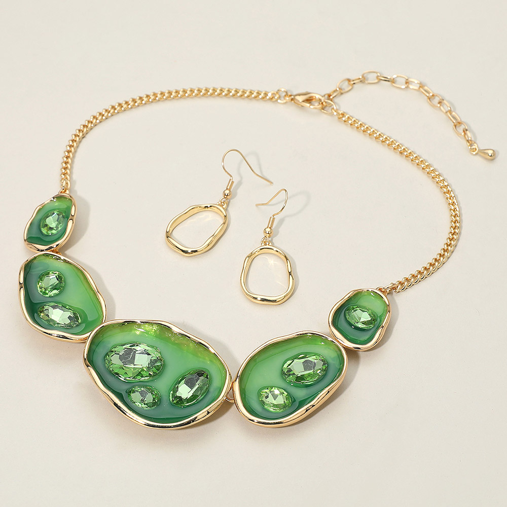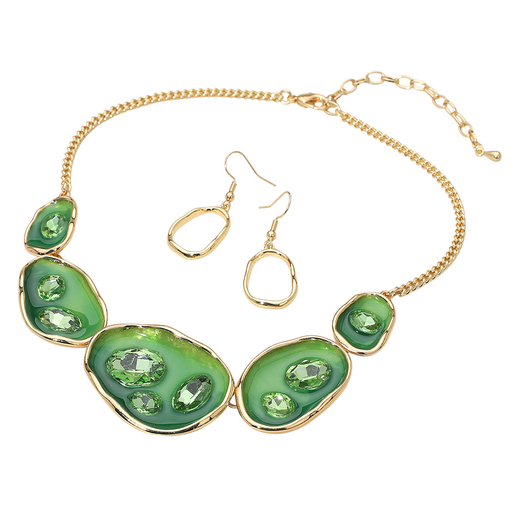 • Contemporary jewelry set featuring a bold necklace and matching earrings with artistic gem accents framed in fluid shapes. Perfect for parties, formal events, or chic everyday wear. A statement-making accessory that combines modern style with elegant sophistication.