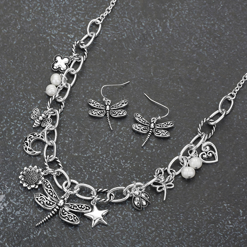 Antique Metal Dragonfly Quatrefoil Ladybug Bumble Bee Crescent Flower Heart Pearl Charm Station Necklace