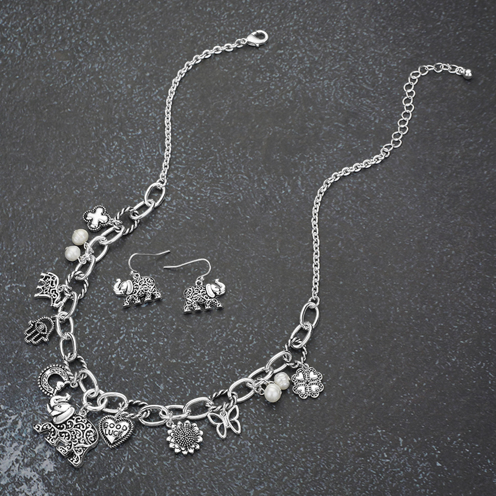 Antique Metal Elephant Hamsa Hand Clover Quatrefoil Butterfly Good Luck Heart Pearl Charm Station Necklace