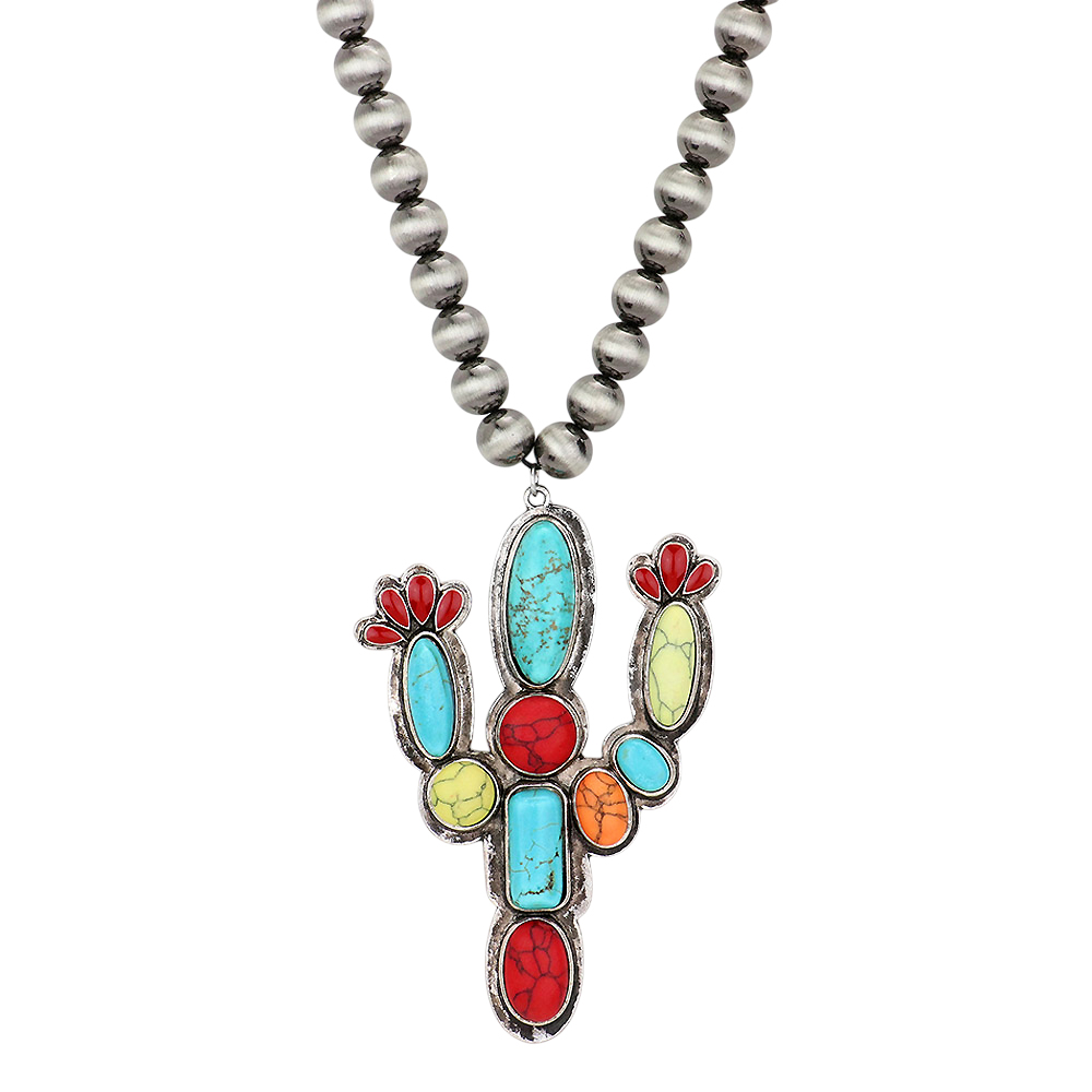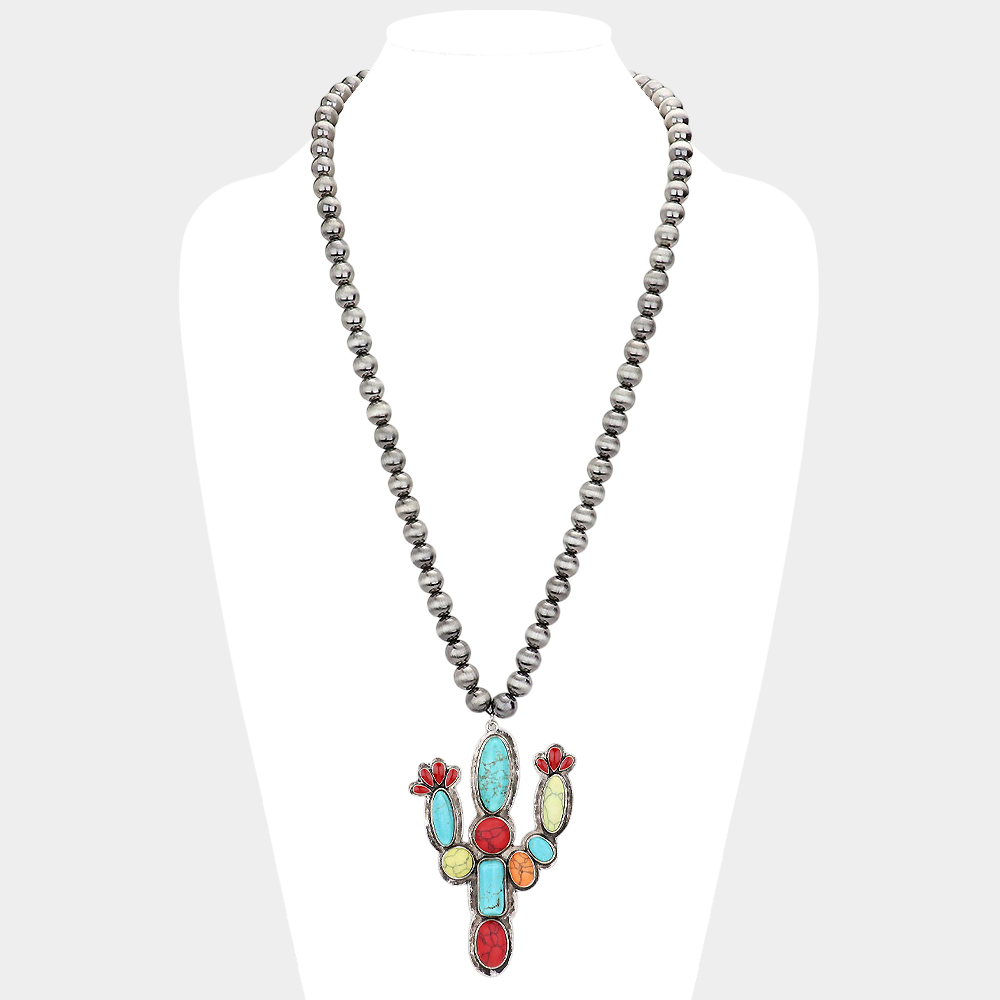 Antique Metal Natural Stone Cactus Pendant Necklace