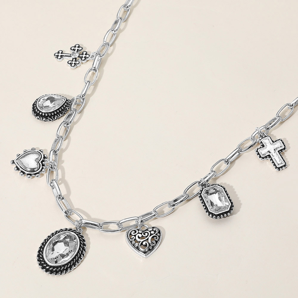 • Elegant charm necklace featuring a mix of heart, cross, and gemstone-inspired pendants on a stylish chain. Perfect for layering or wearing solo, this versatile piece adds timeless character to casual and dressy outfits alike.