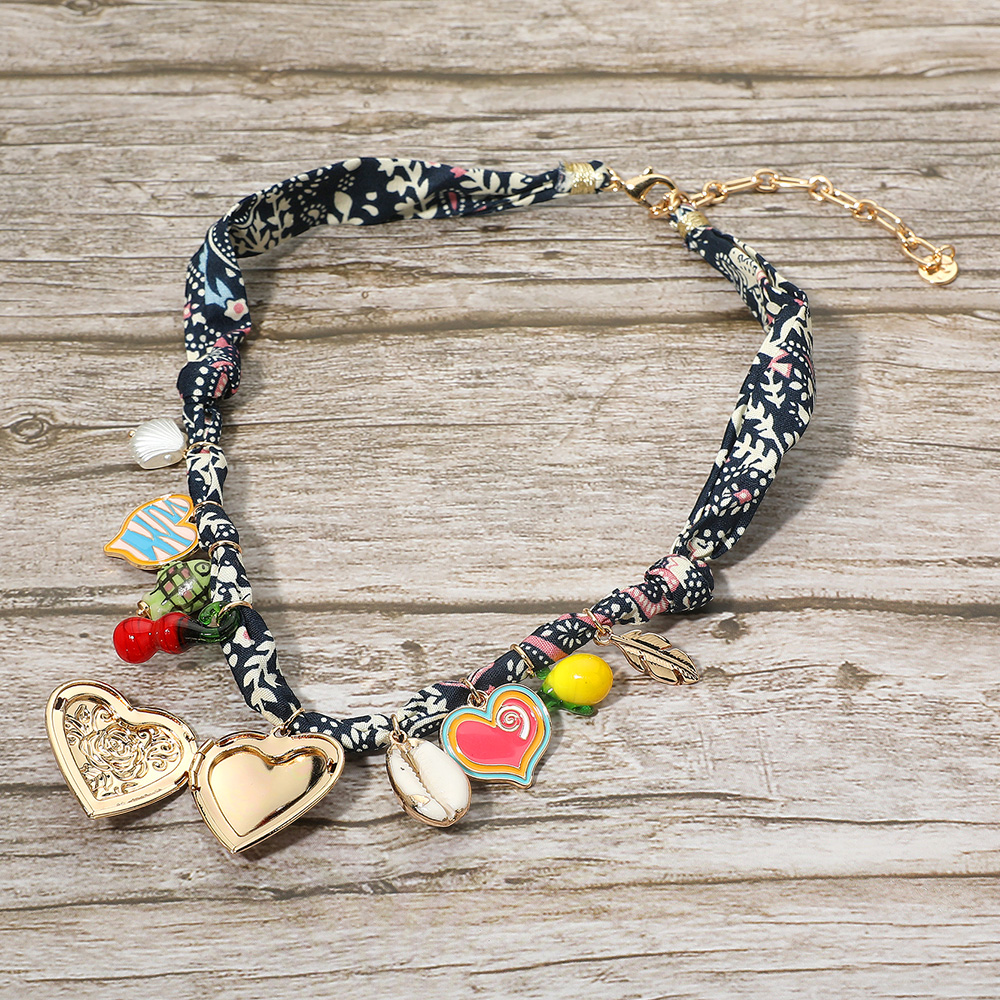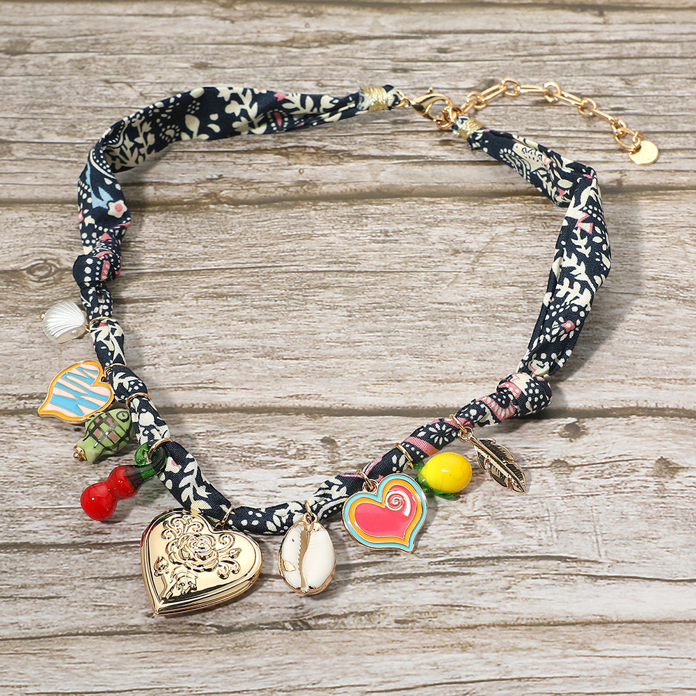 Details • Necklace Size : 17.5" + 3.75" L • Decor Size : 1.4" L • Make a statement with this boho-chic fabric necklace featuring playful charms, including a locket heart, seashell, lemon, cherries, and colorful enamel accents. A vibrant mix of whimsical and coastal elements, perfect for adding personality to everyday and vacation outfits. • Lead and Nickel Compliant