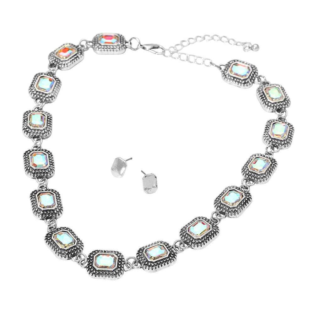 Details • Necklace Size : 17" + 3" L • Decor Size : 0.6" L • Earrings Size : 0.4" L • This iridescent gem necklace and earring set features dazzling rectangular stones framed in intricate vintage-inspired settings. Designed to reflect light beautifully, it adds timeless sparkle to any look, making it perfect for both special occasions and elegant everyday wear. • Lead and Nickel Compliant