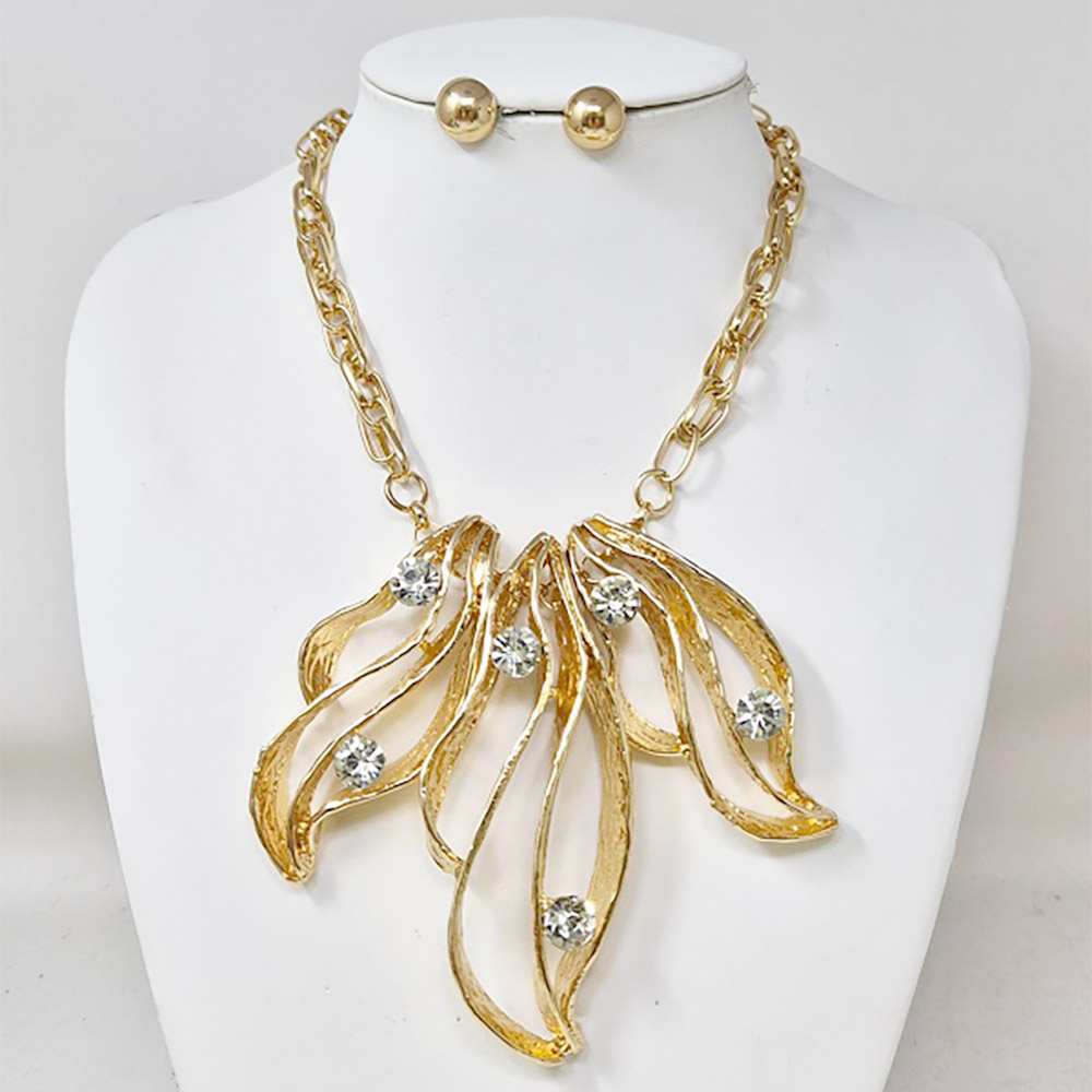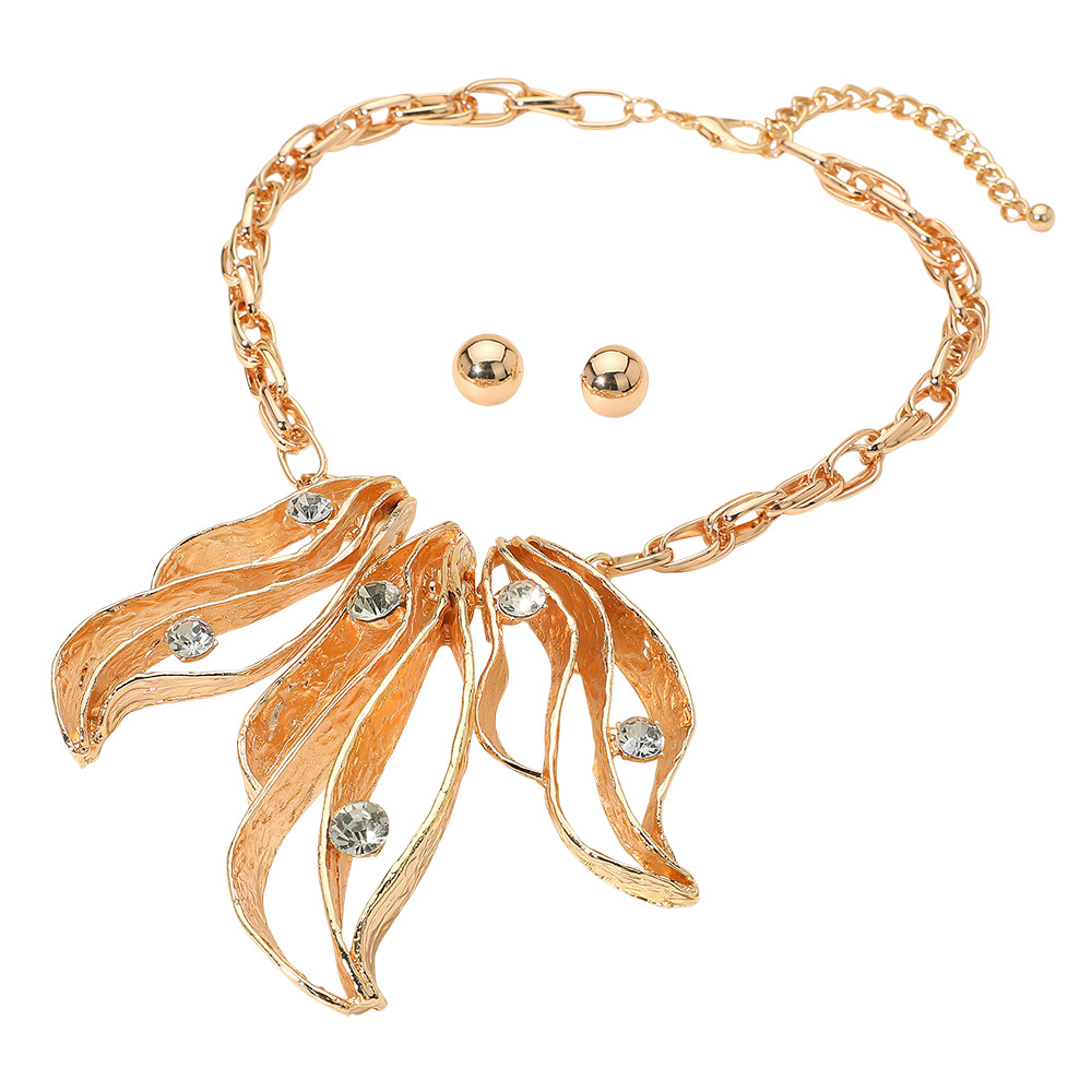 Details • Necklace Size : 18" + 3" L • Decor Size : 4" L • Earrings Size : 0.5" L • This abstract leaf statement necklace set captures artistic sophistication with its sculpted openwork design and sparkling crystal accents. Paired with simple stud earrings, it creates a balanced, elegant look perfect for formal occasions or adding a refined touch to everyday style. • Lead and Nickel Compliant