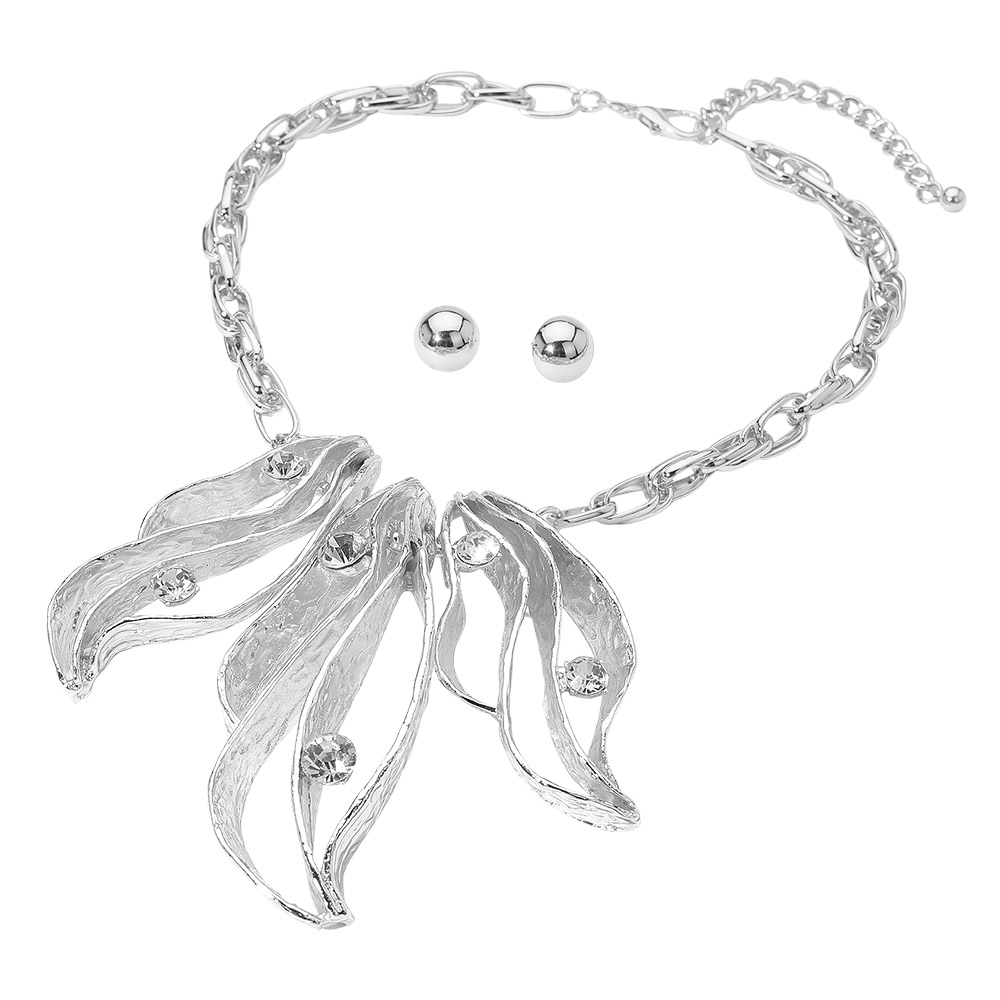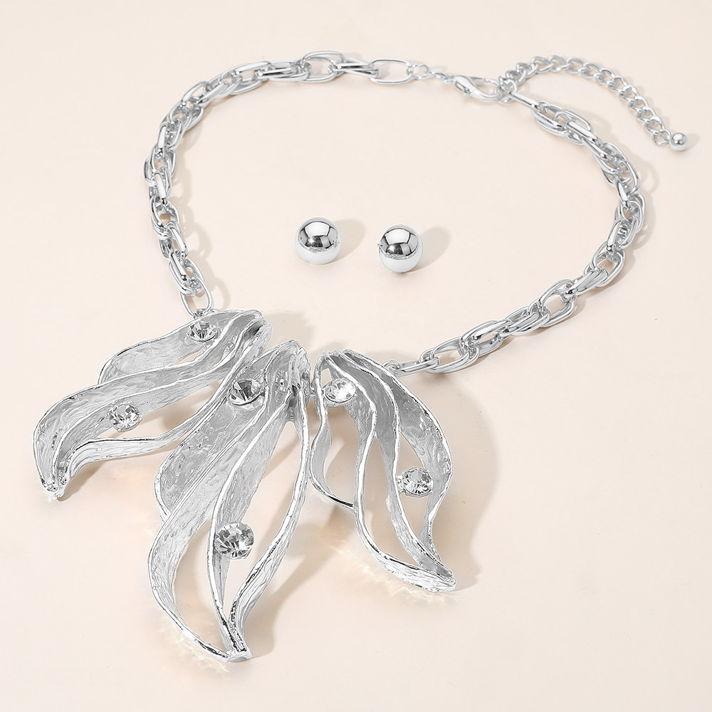 • This abstract leaf statement necklace set captures artistic sophistication with its sculpted openwork design and sparkling crystal accents. Paired with simple stud earrings, it creates a balanced, elegant look perfect for formal occasions or adding a refined touch to everyday style.