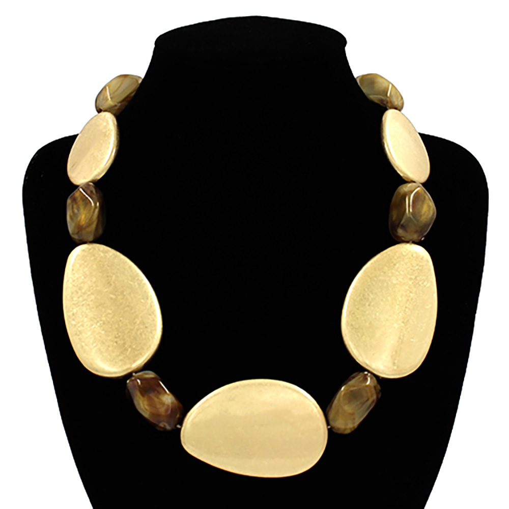Bold Brushed Metal Plate Marbled Pebble Beaded Statement Necklace