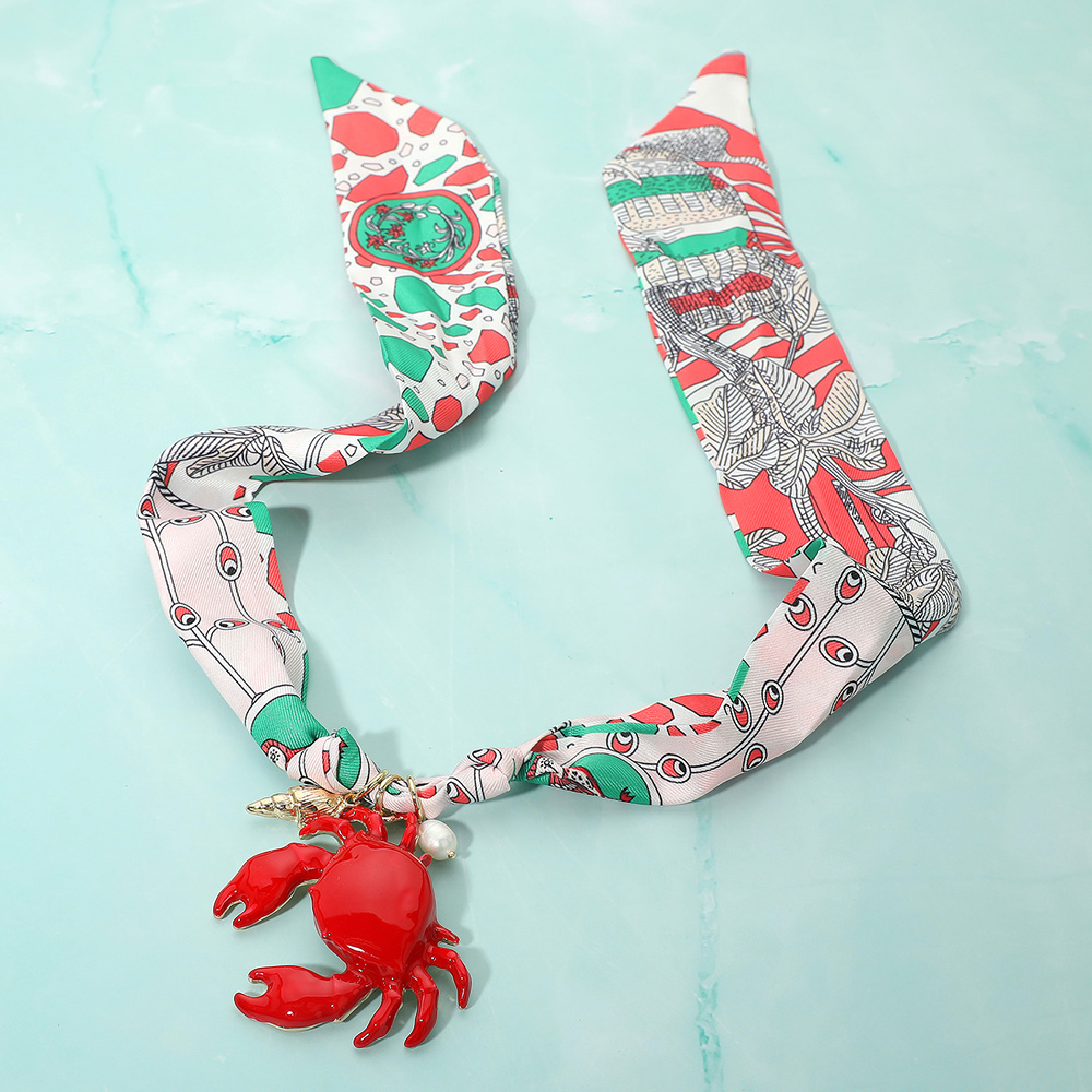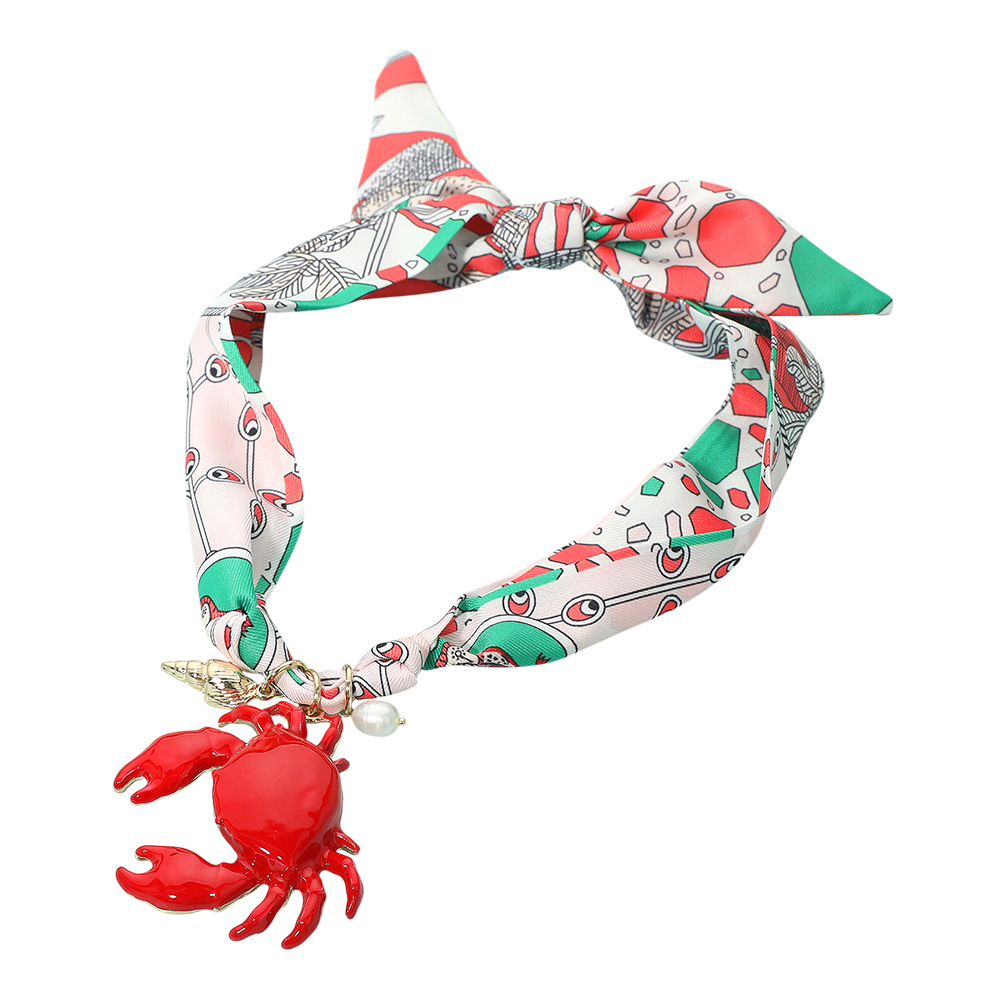 Details • Necklace Size : 31" L / Adjustable • Pendant Size : 2.25" X 2.8" • Print May Vary • Playful scarf necklace featuring a patterned fabric tie with a bold crab pendant, seashell accent, and pearl detail. Adjustable and eye-catching, this fun accessory adds a coastal-inspired statement to any casual or vacation outfit. • Lead and Nickel Compliant