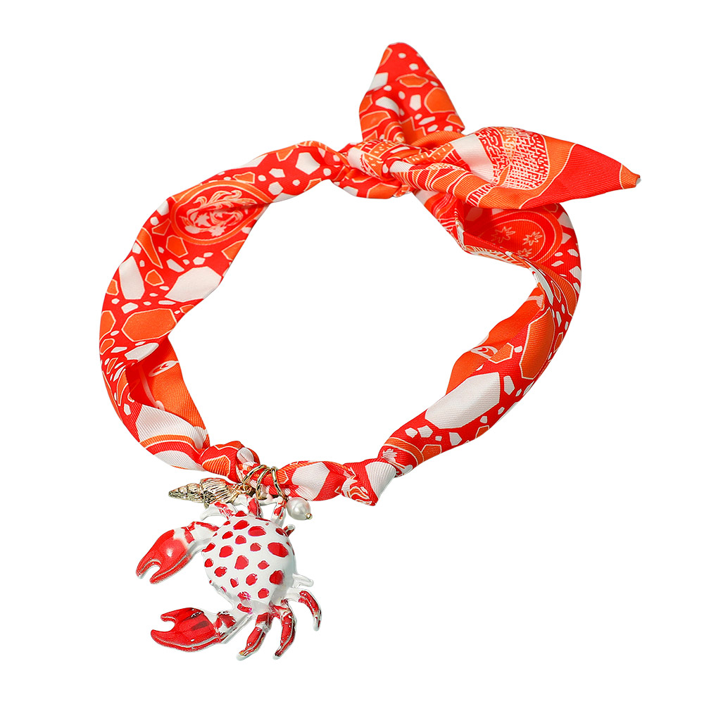 • Playful scarf necklace featuring a patterned fabric tie with a bold crab pendant, seashell accent, and pearl detail. Adjustable and eye-catching, this fun accessory adds a coastal-inspired statement to any casual or vacation outfit.