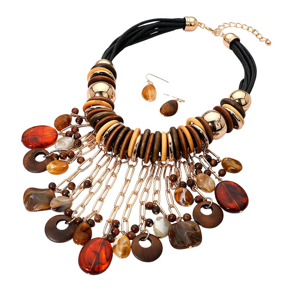 Details • Necklace Size : 17" + 3" L • Decor Size : 5" L • Earrings Size : 1.25" L • Make a bold natural-inspired statement with this layered pendant necklace and earring set featuring sculpted beads, textured rings, and cascading chain details. Its rich mix of shapes and tones adds artistic movement and depth, creating a standout accessory perfect for elevating unique, expressive looks. • Lead and Nickel Compliant