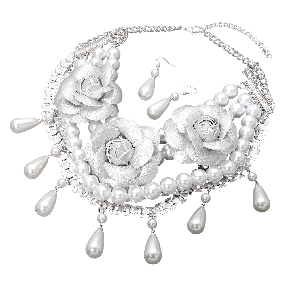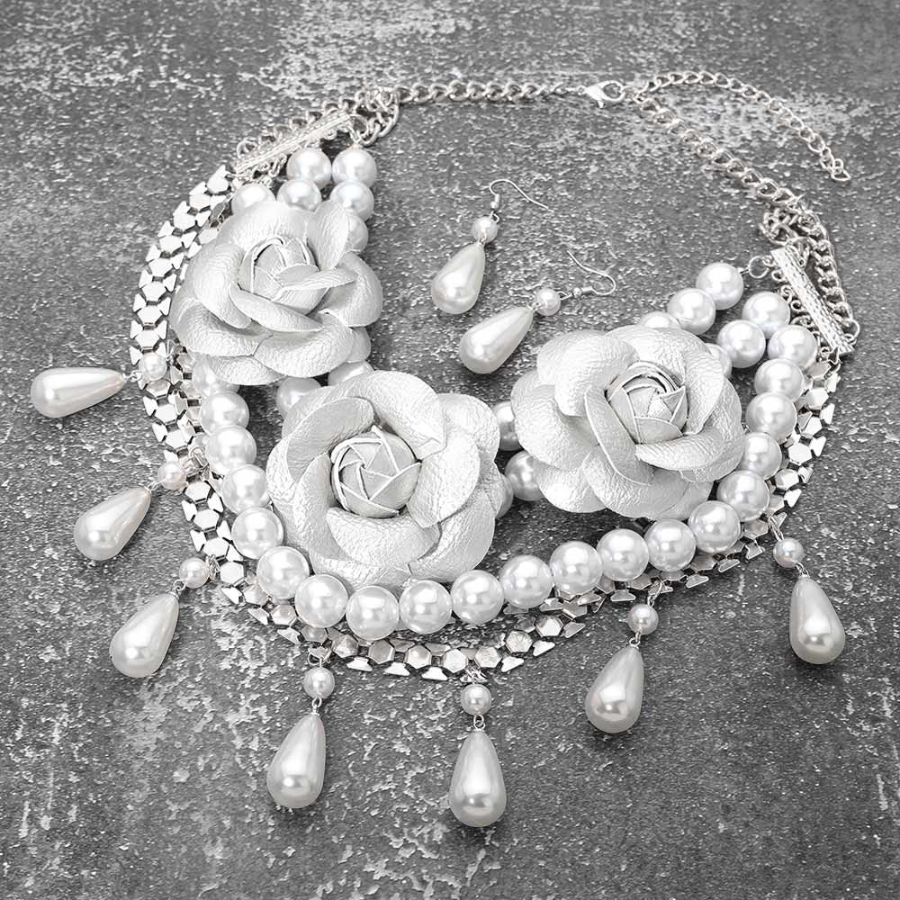 Bold Faux Leather Floral Embellished Pearl Strand Statement Necklace
