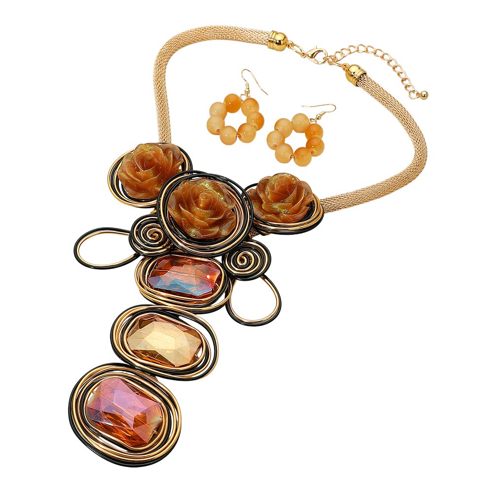 Details • Necklace Size : 19" + 3" L • Decor Size : 7" L • Earrings Size : 2" L • This bold statement necklace and earring set showcases an artistic blend of floral motifs and faceted gem accents. Designed to stand out, it adds dramatic elegance and creative flair to any outfit, making it the perfect accessory for special events or evening glamour. • Lead and Nickel Compliant