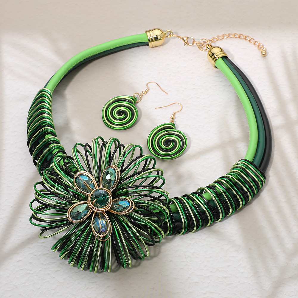 • Make a bold fashion statement with this exquisite necklace and earring set, featuring a large flower centerpiece with layered loops and crystal accents. Paired with spiral drop earrings, this set adds artistic flair and contemporary charm to any elegant or casual outfit.