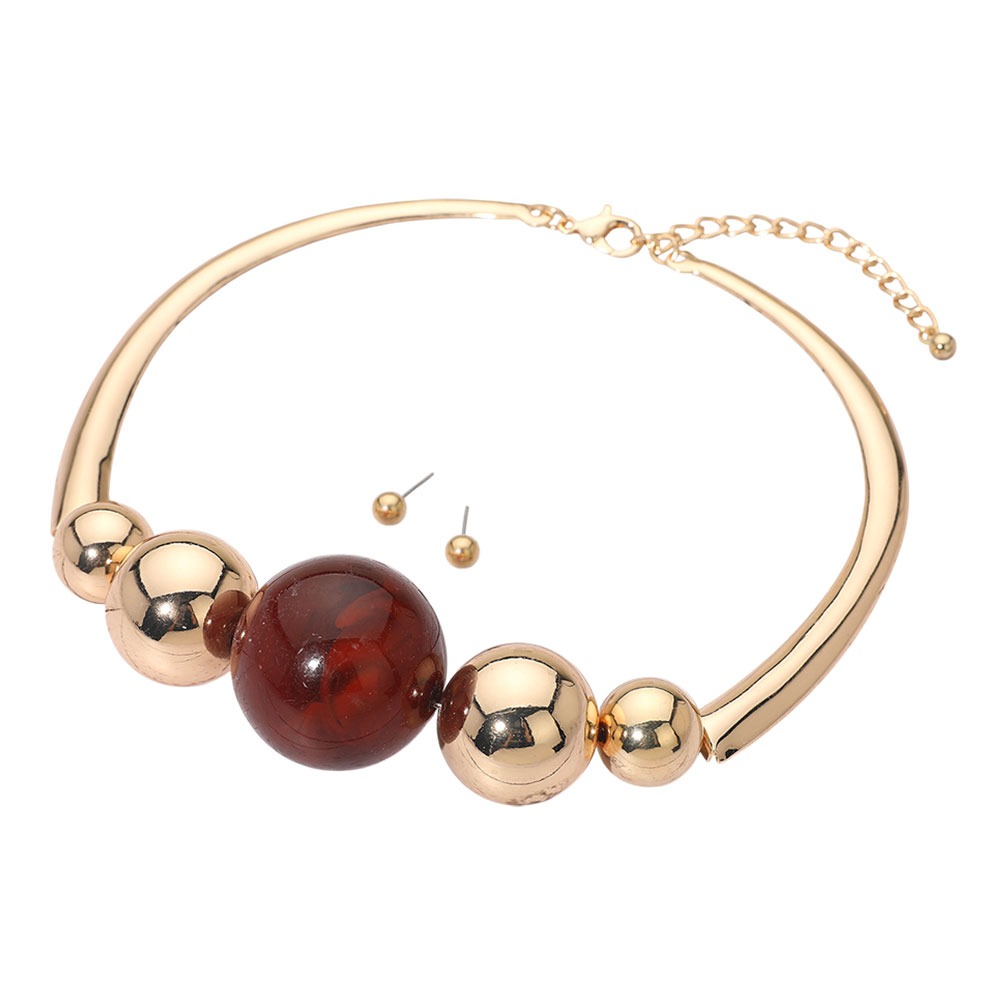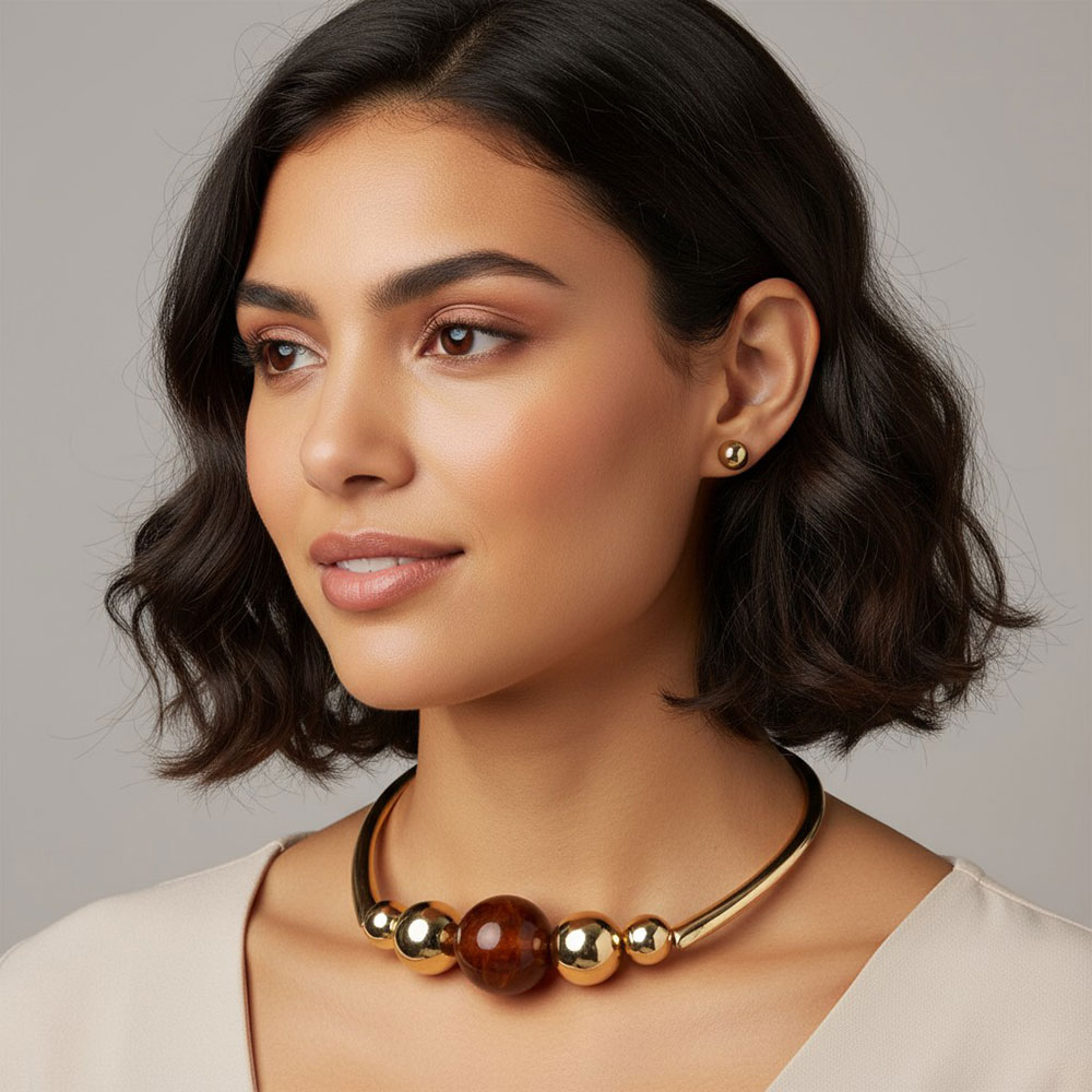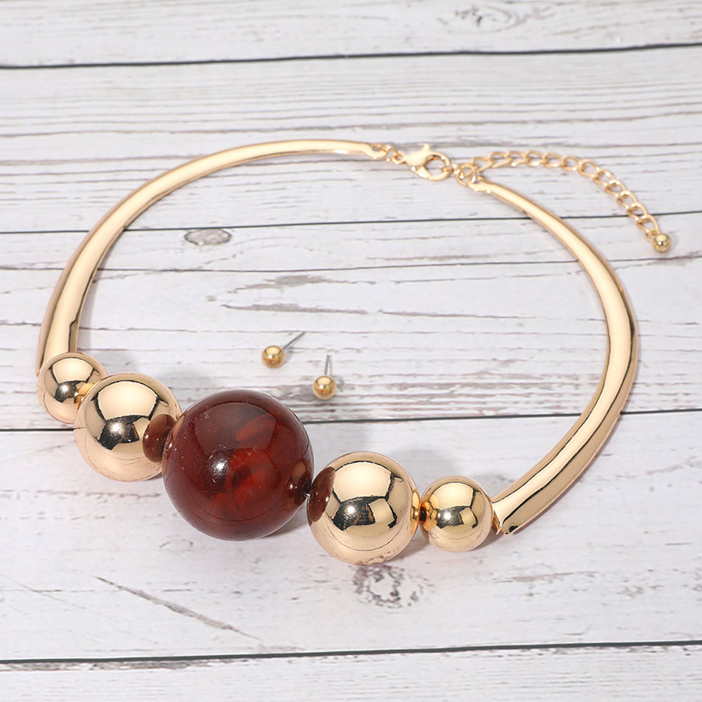 • Bold statement necklace featuring a large central bead framed by polished metallic spheres for a balanced, modern look. Comes with coordinating stud earrings, making it a perfect matching set for formal, evening, or contemporary fashion styling.