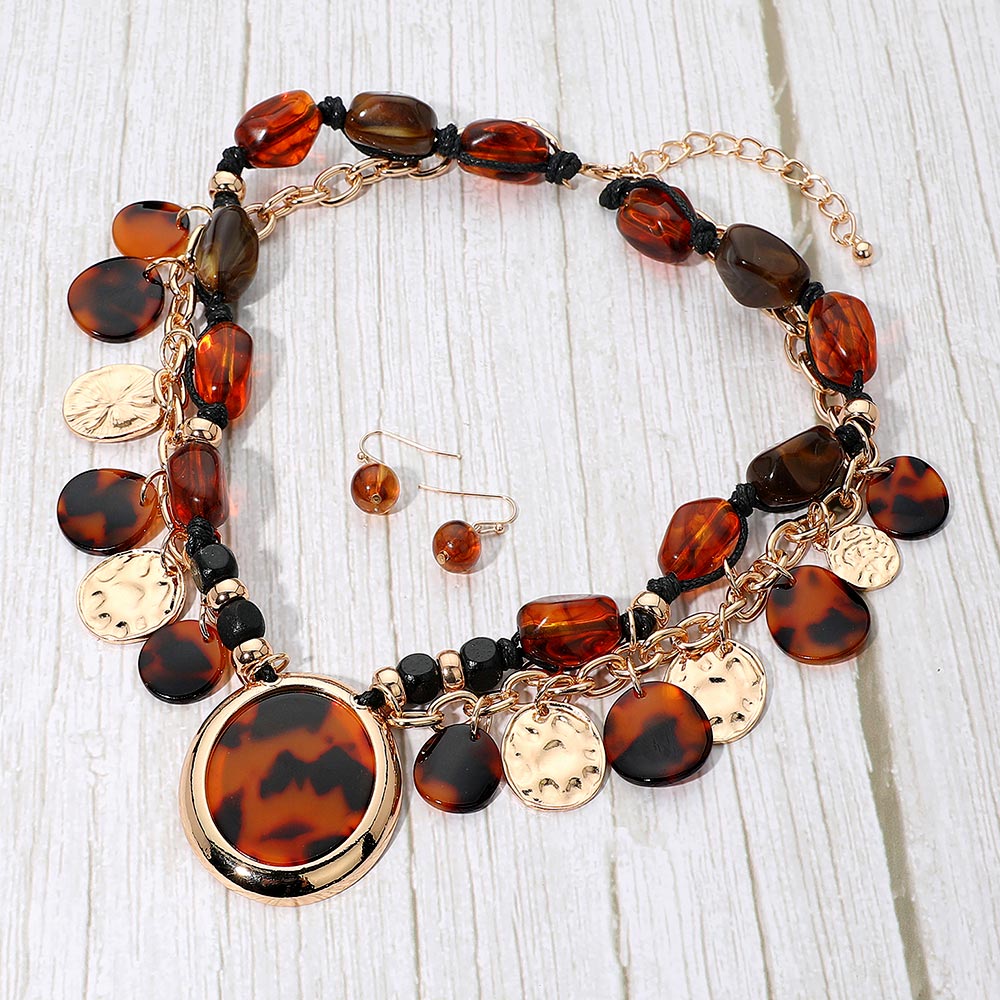 Details • Necklace Size : 19" + 3" L • Decor Size : 2" L • Earrings Size : 1" L • Stand out with this layered charm necklace and earring set featuring a striking mix of patterned medallions, textured discs, and glossy beads. Its bold, fashion-forward design adds dynamic movement and rich detail, making it the perfect statement accessory for elevating any outfit with effortless flair. • Lead and Nickel Compliant