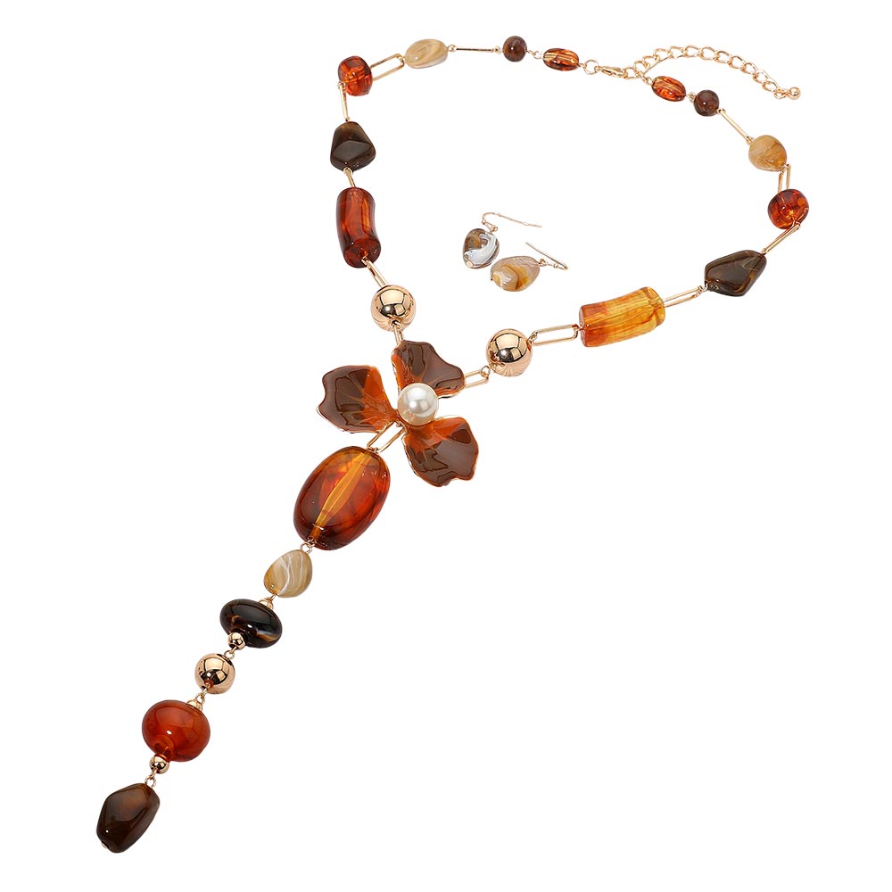 Details • Necklace Size : 21.5" + 3" L • Decor Size : 8.25" L • Earrings Size : 1.25" L • Chic long necklace and earrings set featuring a sculpted floral pendant accented with faceted beads and metallic details. The elegant drop design and mixed shapes create a sophisticated statement piece ideal for dressing up both casual and formal outfits. • Lead and Nickel Compliant