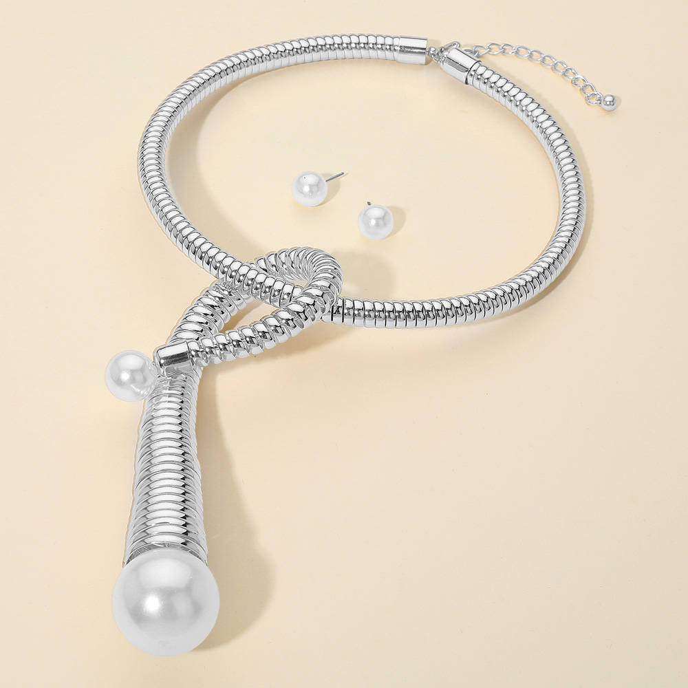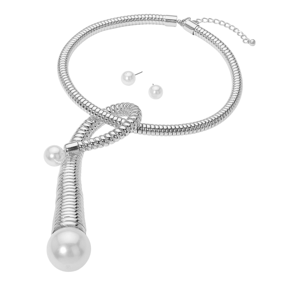 Details • Necklace Size : 18" + 3.5" L • Decor Size : 5.75" L • Earrings Size : 0.5" L • Make a statement with this contemporary coil necklace featuring elegant pearl accents and coordinating stud earrings. Its sleek, knotted design blends sophistication and modern flair, perfect for elevating both everyday outfits and evening ensembles. • Lead and Nickel Compliant
