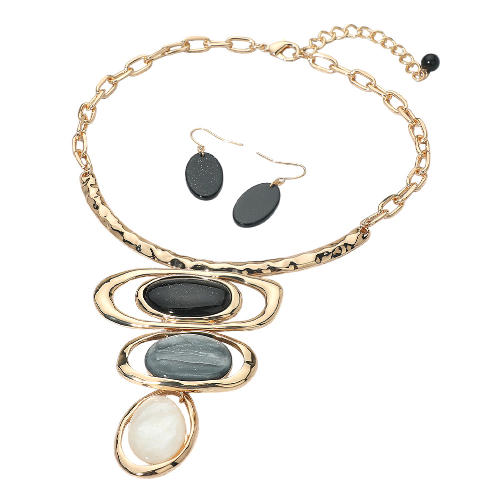 Details • Necklace Size : 17" + 4" L • Decor Size : 4" L • Earrings Size : 1.7" L • Make a statement with this bold necklace and earrings set featuring layered geometric pendants and matching drop earrings. The striking design enhances any outfit, perfect for parties, evenings, or special occasions. Add a modern artistic touch to your jewelry collection with this stunning set. • Lead and Nickel Compliant