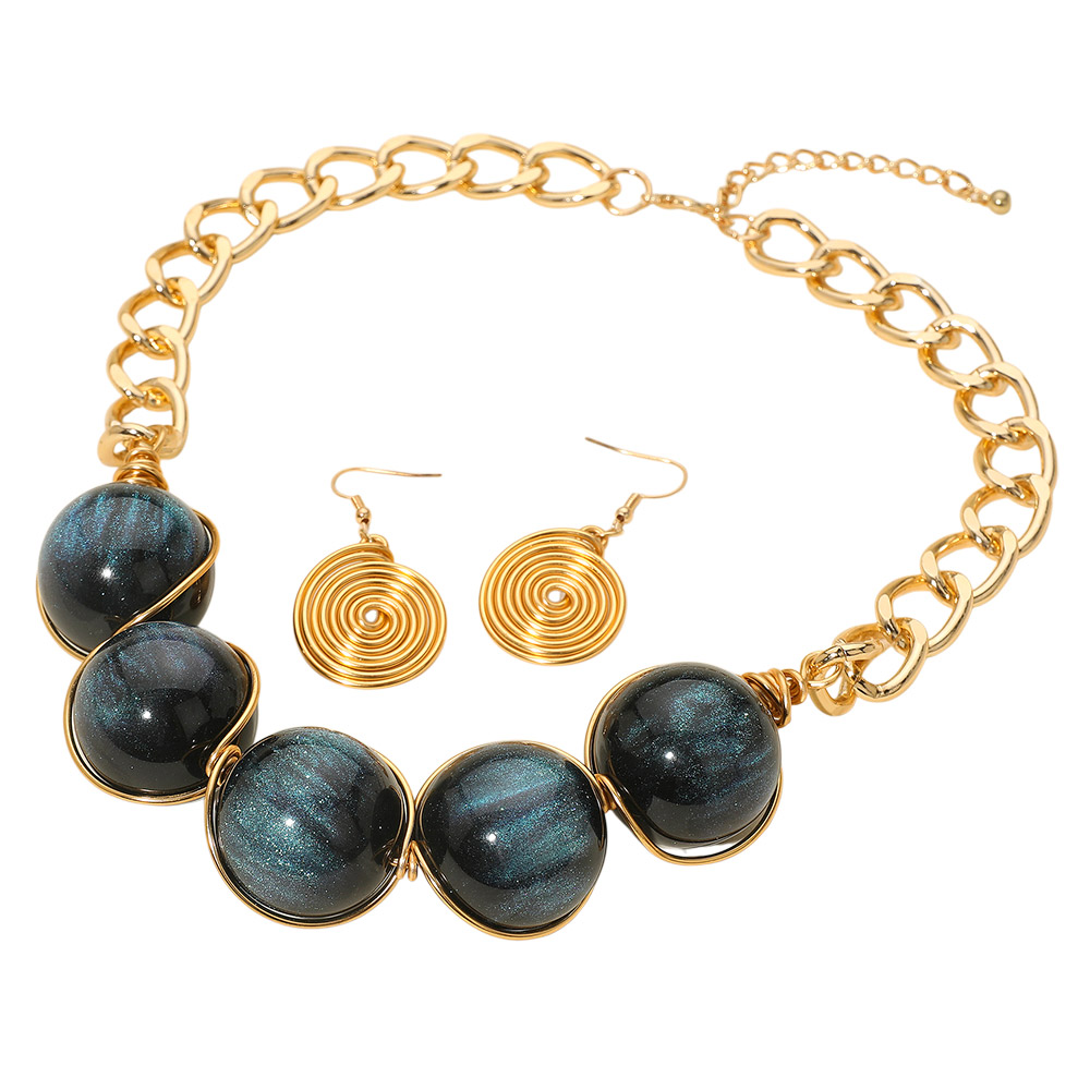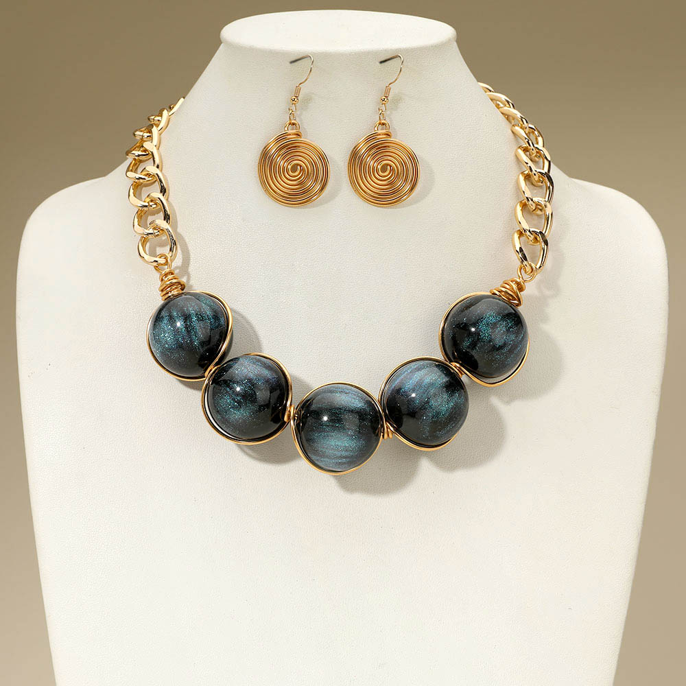 Details • Necklace Size : 22" + 3" L • Decor Size : 1.25" L • Earrings Size : 2.25" L • Make a statement with this striking necklace and matching earrings set, featuring oversized glossy spheres and spiral drop earrings. Designed with a chunky chain and artistic wire detailing, this set adds a modern and bold touch to elevate any fashion-forward look. • Lead and Nickel Compliant
