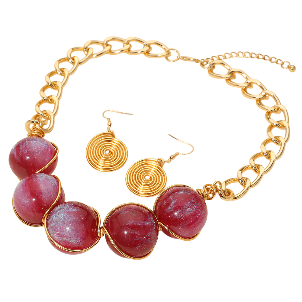 Details • Necklace Size : 22" + 3" L • Decor Size : 1.25" L • Earrings Size : 2.25" L • Make a statement with this striking necklace and matching earrings set, featuring oversized glossy spheres and spiral drop earrings. Designed with a chunky chain and artistic wire detailing, this set adds a modern and bold touch to elevate any fashion-forward look. • Lead and Nickel Compliant
