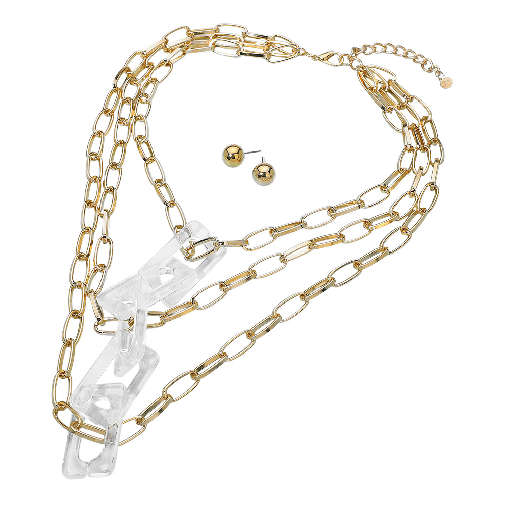 Details • Necklace Size : 18.5" + 4"L • Decor Size : 5" L • Earrings Size : 0.4" L • Bold layered chain necklace designed with oversized links and paired with matching stud earrings for a polished finish. Perfect for making a statement, this versatile jewelry set complements casual and dressy looks, adding modern edge and sophistication to your accessory collection. • Lead and Nickel Compliant
