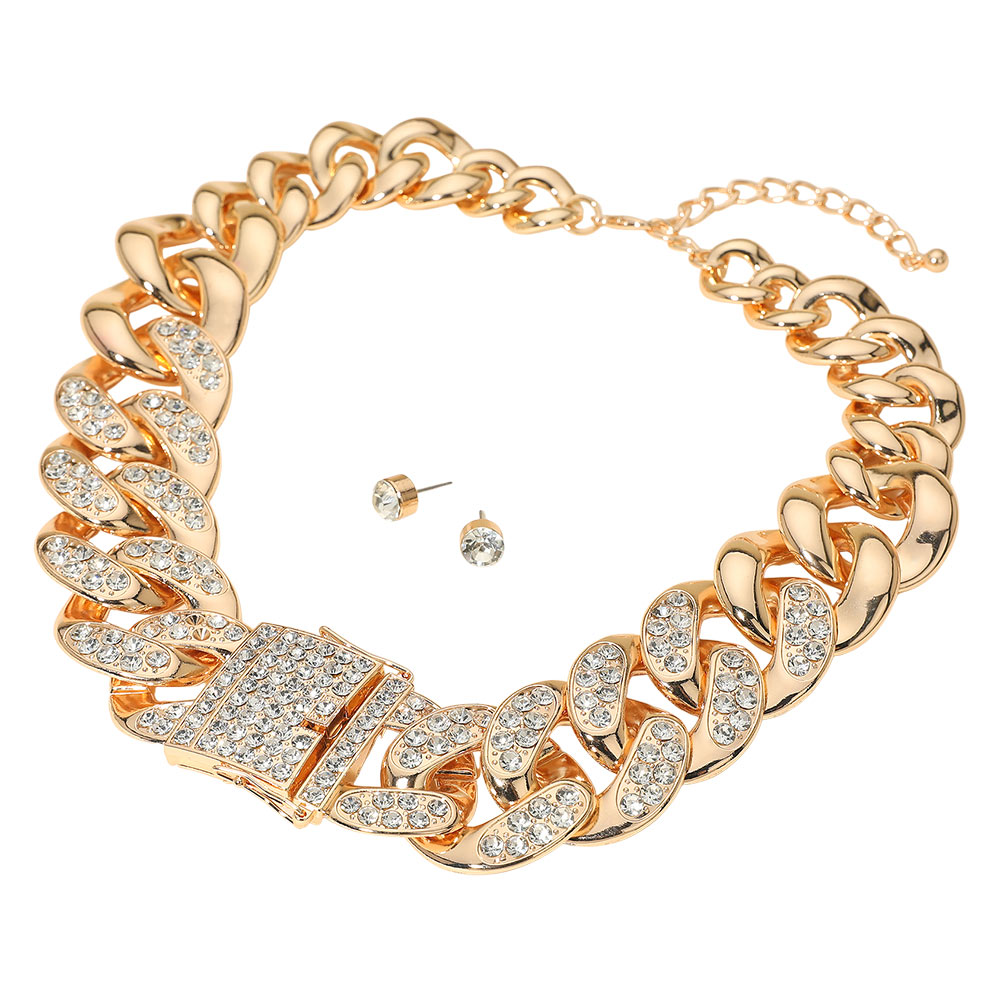 Details • Necklace Size : 18.75" + 3" L • Decor Size : 1.5" L • Earrings Size : 0.3" L • This striking necklace and earring set showcases oversized linked detailing adorned with shimmering stones for a bold, glamorous look. Designed to elevate evening outfits and special occasions, it delivers eye-catching sparkle and a coordinated finish that enhances any standout style. • Lead and Nickel Compliant