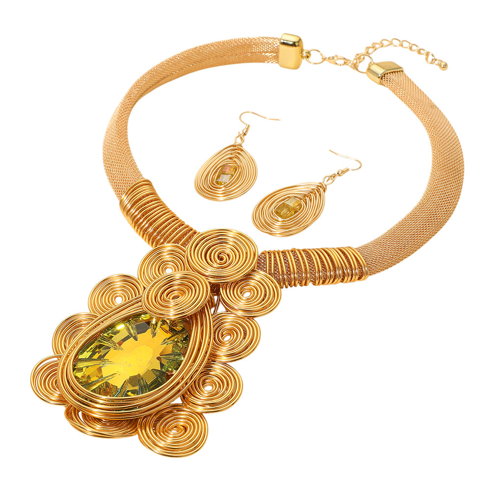 Details • Necklace Size : 18" + 2.5" L • Decor Size : 4" L • Earrings Size : 2.5" L • Make an impression with this bold teardrop statement necklace and matching earrings, featuring artistic swirl accents and a radiant centerpiece. Perfect for special occasions, parties, or elevating everyday fashion with a unique touch. • Lead and Nickel Compliant
