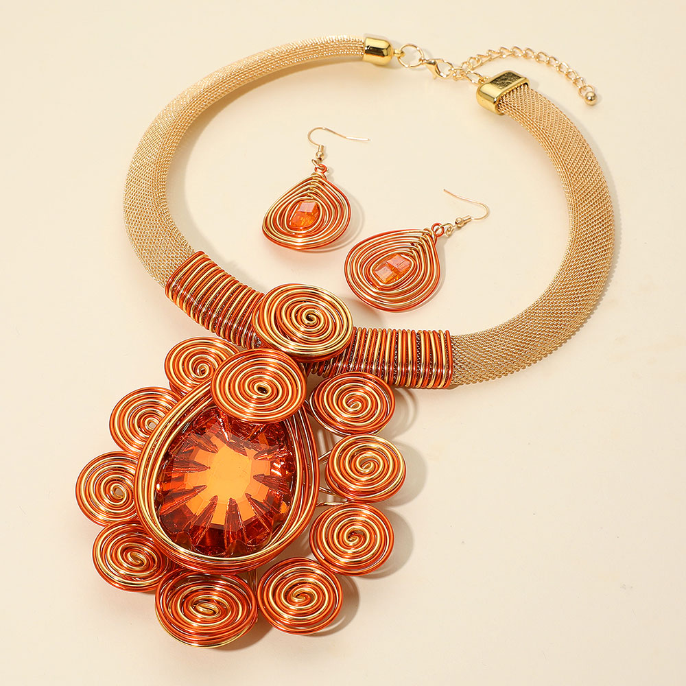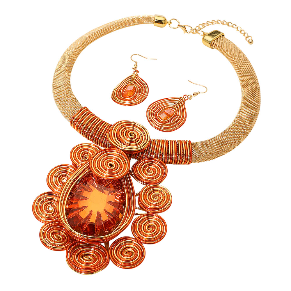 Details • Necklace Size : 18" + 2.5" L • Decor Size : 4" L • Earrings Size : 2.5" L • Make an impression with this bold teardrop statement necklace and matching earrings, featuring artistic swirl accents and a radiant centerpiece. Perfect for special occasions, parties, or elevating everyday fashion with a unique touch. • Lead and Nickel Compliant