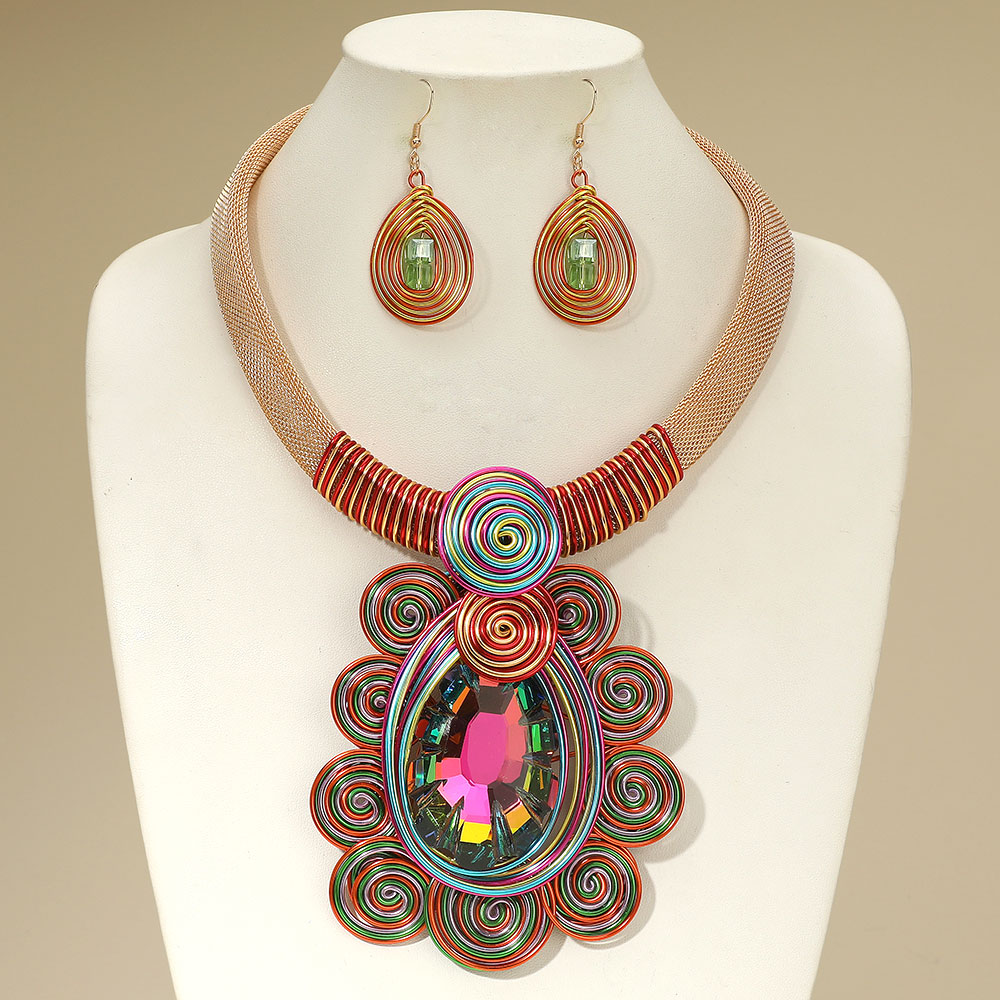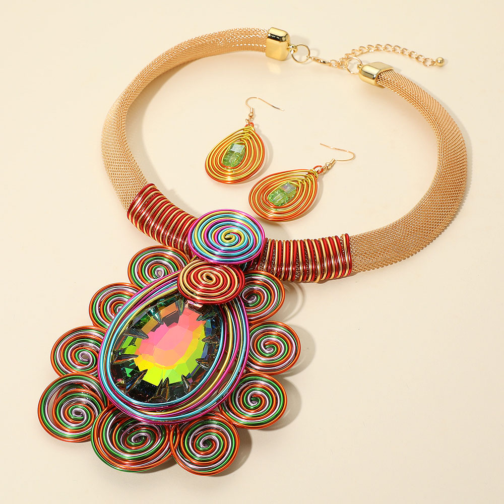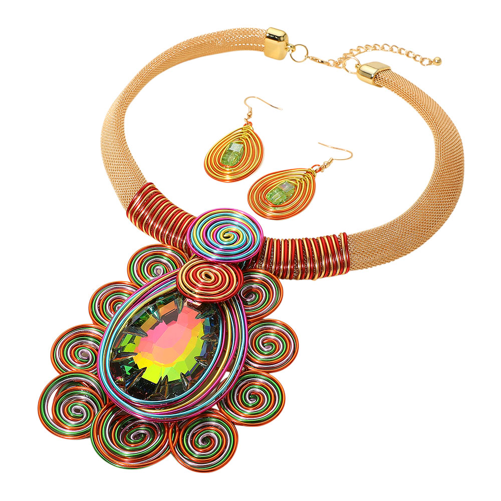 Details • Necklace Size : 18" + 2.5" L • Decor Size : 4" L • Earrings Size : 2.5" L • Make an impression with this bold teardrop statement necklace and matching earrings, featuring artistic swirl accents and a radiant centerpiece. Perfect for special occasions, parties, or elevating everyday fashion with a unique touch. • Lead and Nickel Compliant