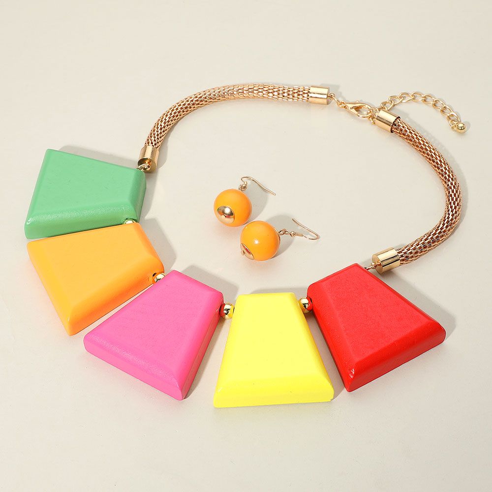 Details • Necklace Size : 20.5" + 3.25" L • Decor Size : 2.25" L • Earrings Size : 1.75" L • Bold trapezoid necklace and earring set with chunky geometric wooden beads and mesh chain. Perfect for adding a playful, artistic edge to any modern outfit or creative look. • Lead and Nickel Compliant
