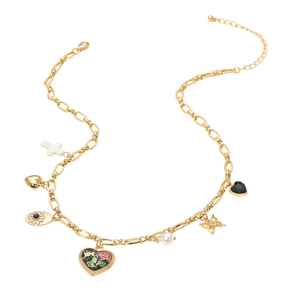 Details • Necklace Size : 16.5" + 3.25" L • Decor Size : 0.8" L • Elevate your accessories with this charm necklace featuring a mix of symbolic pendants including hearts, floral details, a cross, and pearl accents. Designed on a bold chain, this statement piece adds personality, elegance, and versatility to both casual and dressy outfits. • Lead and Nickel Compliant