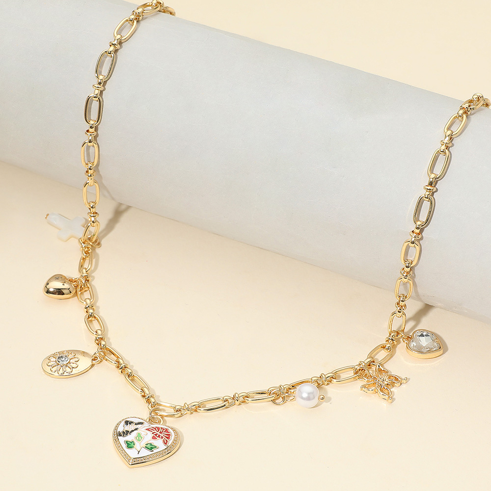 Details • Necklace Size : 16.5" + 3.25" L • Decor Size : 0.8" L • Elevate your accessories with this charm necklace featuring a mix of symbolic pendants including hearts, floral details, a cross, and pearl accents. Designed on a bold chain, this statement piece adds personality, elegance, and versatility to both casual and dressy outfits. • Lead and Nickel Compliant