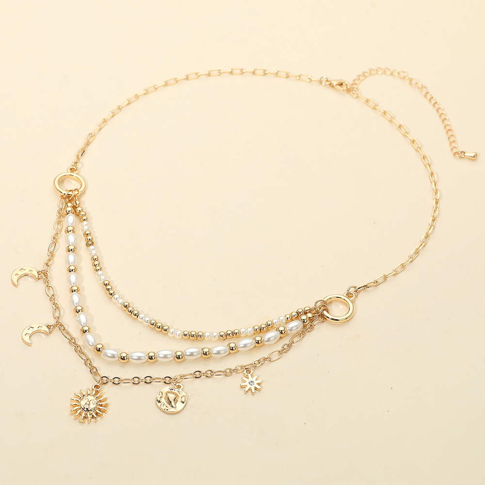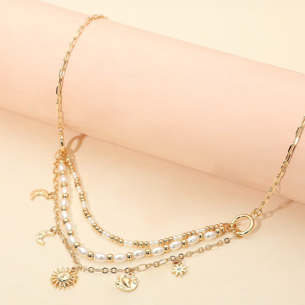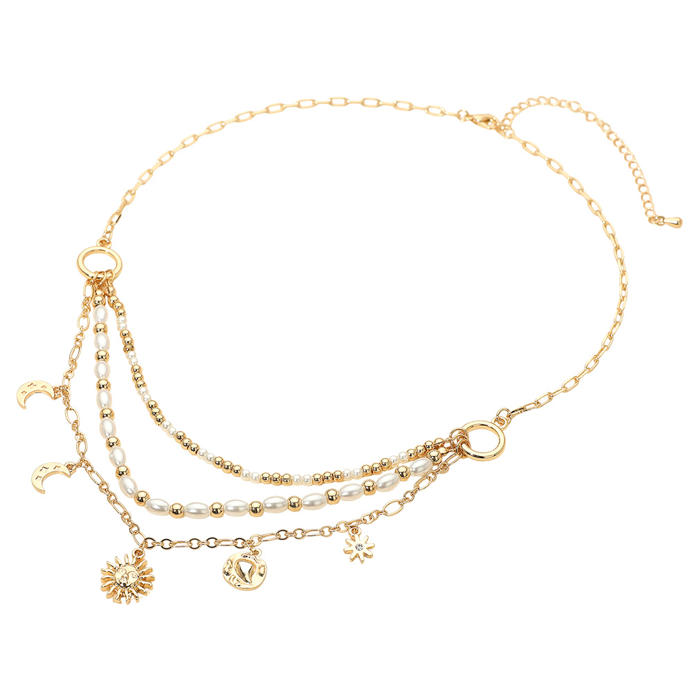 Details • Necklace Size : 16.5" + 3.5" L • Decor Size : 2.3" L • Trendy layered necklace featuring mixed chains and beads with celestial charms including moon, sun, and star designs. Perfect for adding a touch of cosmic elegance to any casual or dressy outfit. • Lead and Nickel Compliant