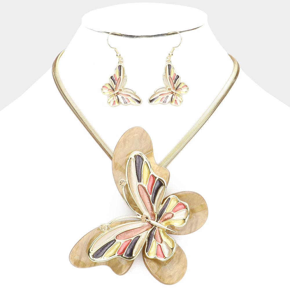 Celluloid Acetate Colored Metal Butterfly Pendant Necklace