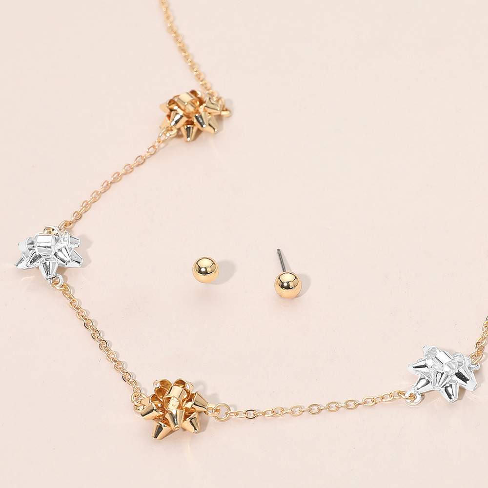Details • Size : 17" + 2.5" L • Decor Size : 0.5" L • Earrings Size : 0.2" L • Charming necklace and earring set featuring bow-shaped accents for a fun and festive look. Perfect for celebrations, parties, or seasonal gatherings, this playful jewelry set adds a cheerful touch to your outfit while maintaining a stylish and coordinated appeal. • Lead and Nickel Compliant