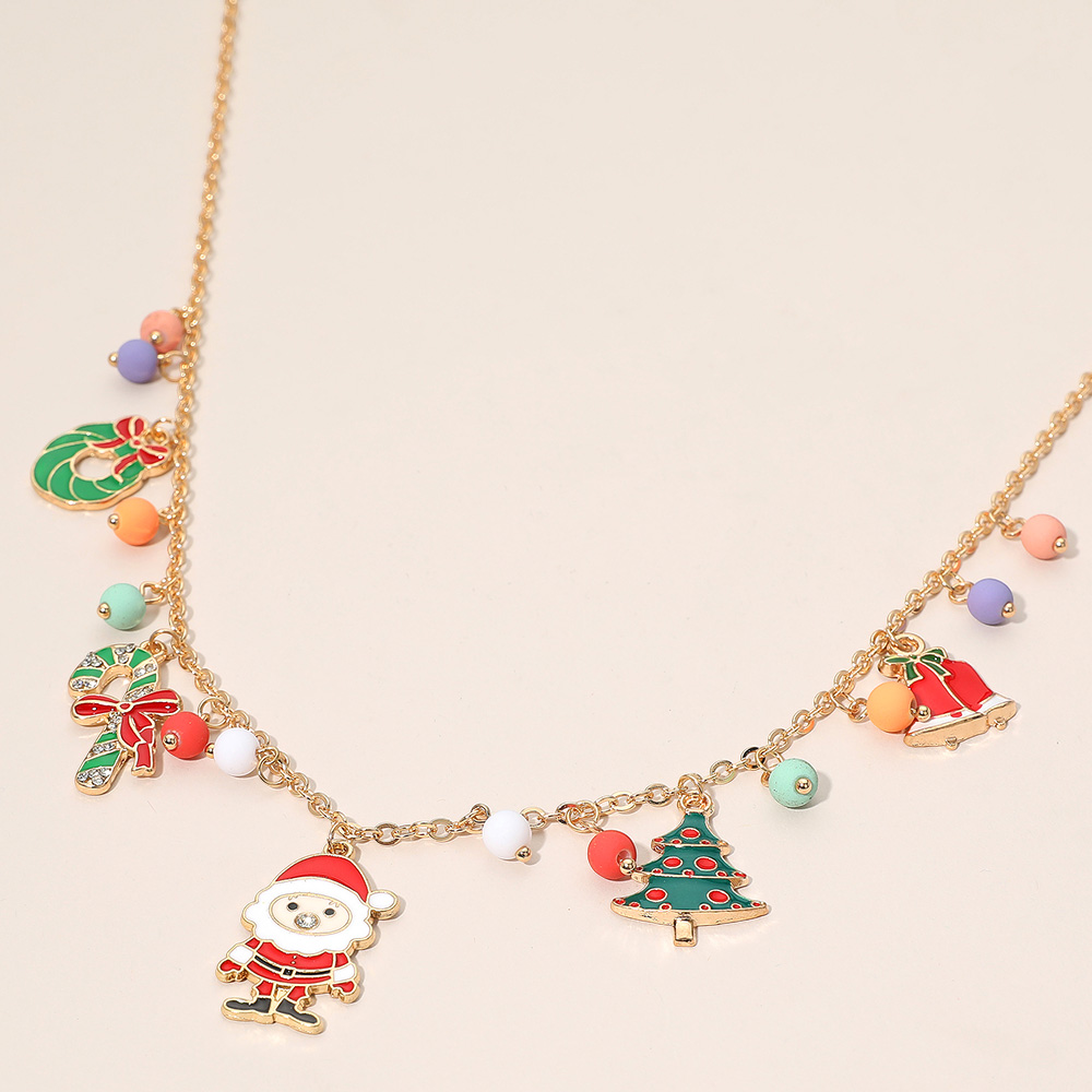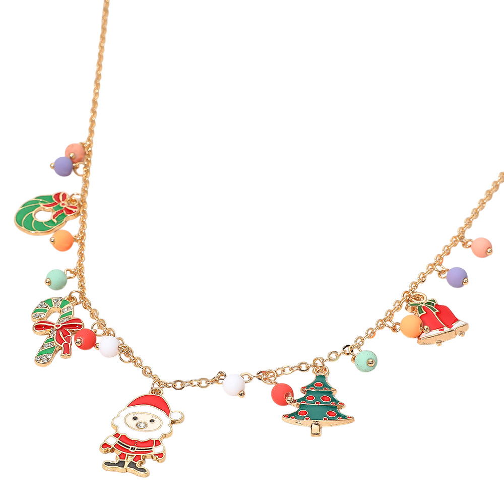 Details • Necklace Size : 16.5" + 3.5" L • Decor Size : 1.6" L • Spread holiday cheer with this Christmas charm necklace featuring festive pendants like Santa, a tree, candy cane, and bell. Accented with colorful beads on a delicate chain, this playful accessory is perfect for holiday parties, gift giving, or adding seasonal sparkle to your look. • Lead and Nickel Compliant