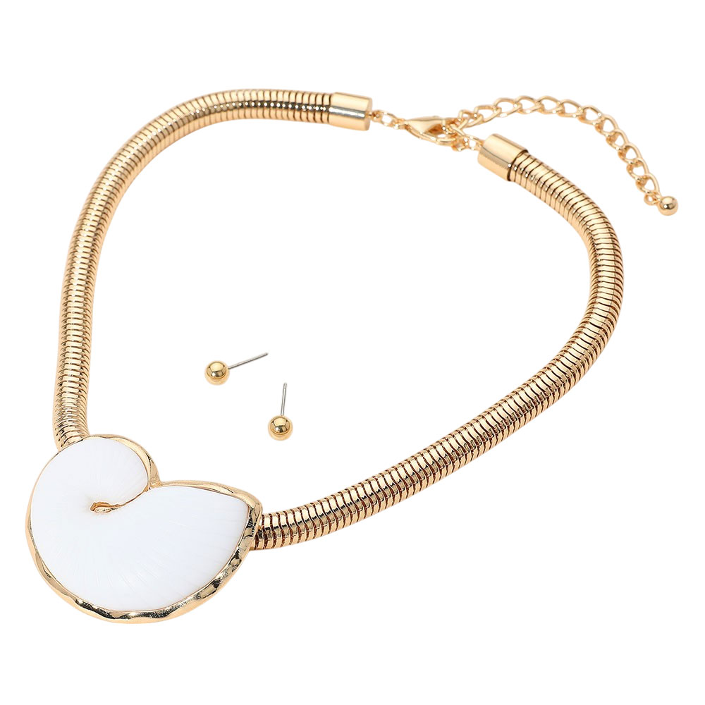 Details • Necklace Size : 16.5" + 3.5" L • Pendant Size : 2" X 1.5" • Earrings Size : 0.1" L • This sculpted shell pendant collar necklace features a sleek, coiled band paired with a smooth shell-inspired centerpiece. Designed to exude contemporary elegance, it perfectly complements both evening and casual looks, offering a striking balance of artistry and timeless sophistication. • Lead and Nickel Compliant