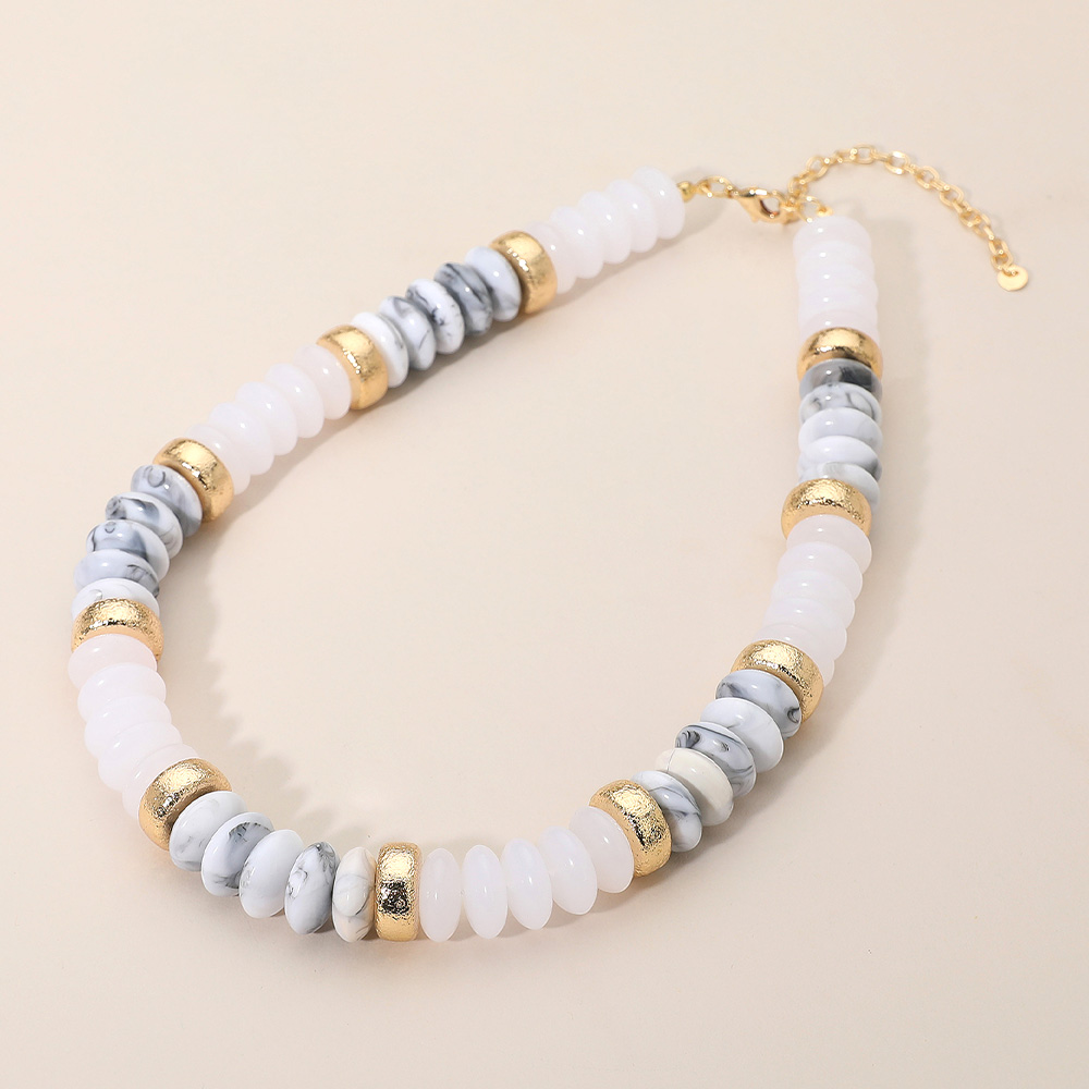 Details • Necklace Size : 17" + 3" L • Decor Size : 0.6" L • Bold and contemporary, this chunky beaded necklace features smooth disc-shaped beads with metallic gold-tone spacers. A versatile statement piece that elevates any outfit with its sleek, modern design. • Lead and Nickel Compliant