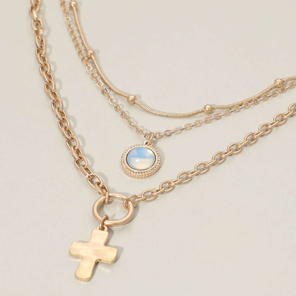 Details • Necklace Size : 14.5" + 3.5" L • Decor Size : 3.4" L • Enhance everyday style with this layered cross charm necklace, featuring multiple delicate chains paired with a classic cross accent and a glowing round detail for added depth. Ideal for effortless layering or wearing solo to create a polished, on-trend look suited to casual or dressy outfits. • Lead and Nickel Compliant