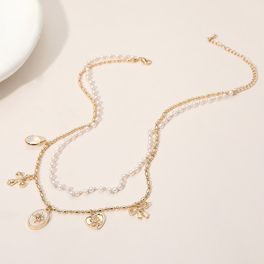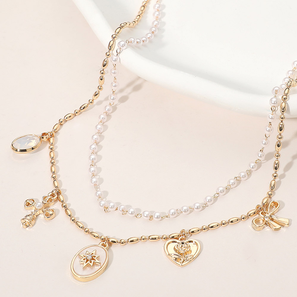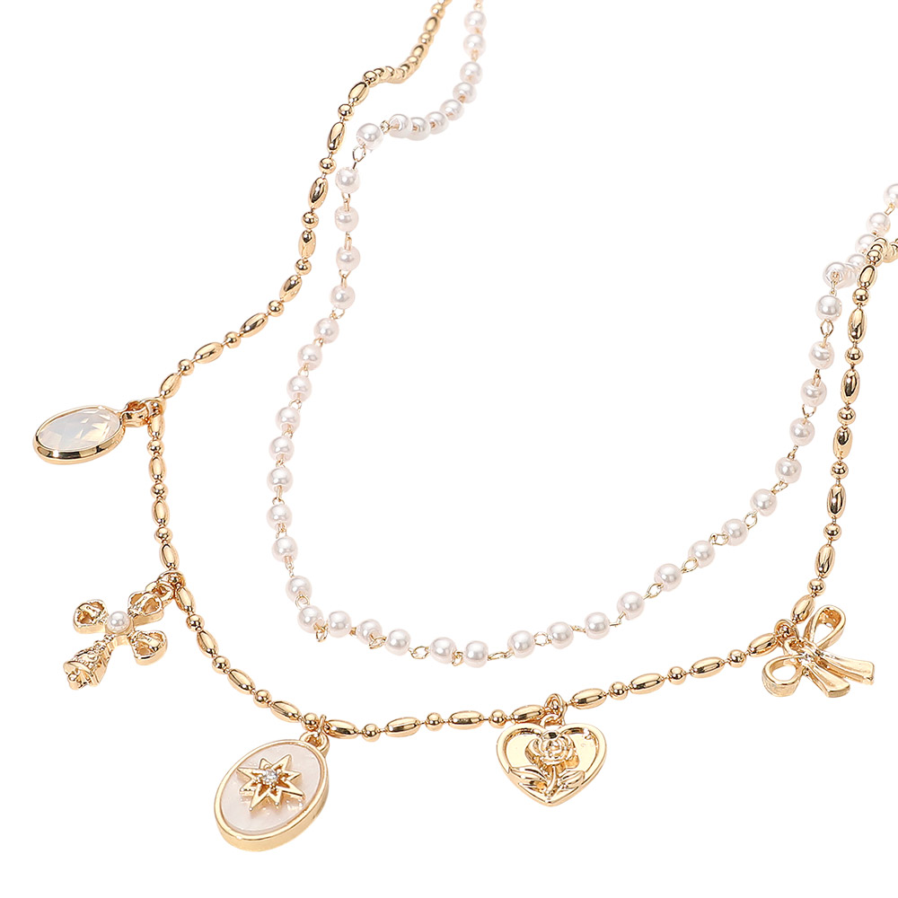 Details • Necklace Size : 15" + 3.5" L • Decor Size : 1.2" L • This layered charm necklace features a delicate blend of beads and gold-tone accents, adorned with heart, star, and bow pendants for a romantic finish. Its double-layered design adds graceful texture, making it a versatile accessory that elevates both casual and dressy looks. • Lead and Nickel Compliant