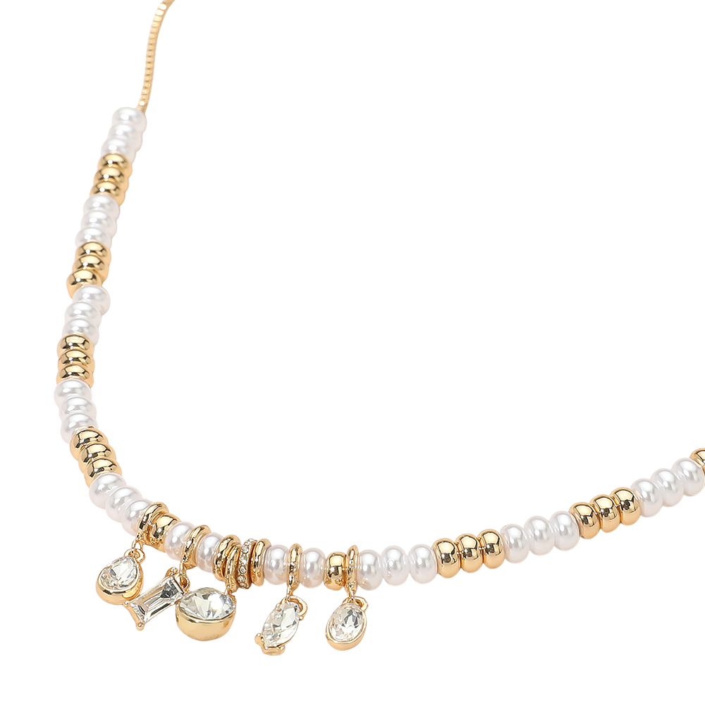 Details • Necklace Size : 16.5" + 3.25" L • Decor Size : 0.75" L • Elevate your style with this elegant necklace featuring a blend of lustrous pearls, polished beads, and sparkling crystal charms. Perfect for both casual and formal occasions, it adds timeless sophistication and a touch of glamour to any outfit. • Lead and Nickel Compliant