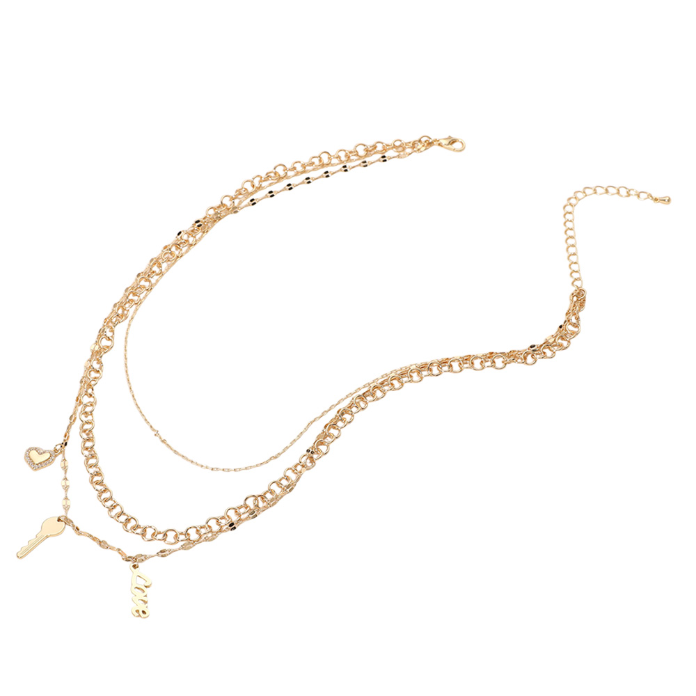 CZ Stone Paved Heart Brass Metal Key LOVE Charm Layered Necklace