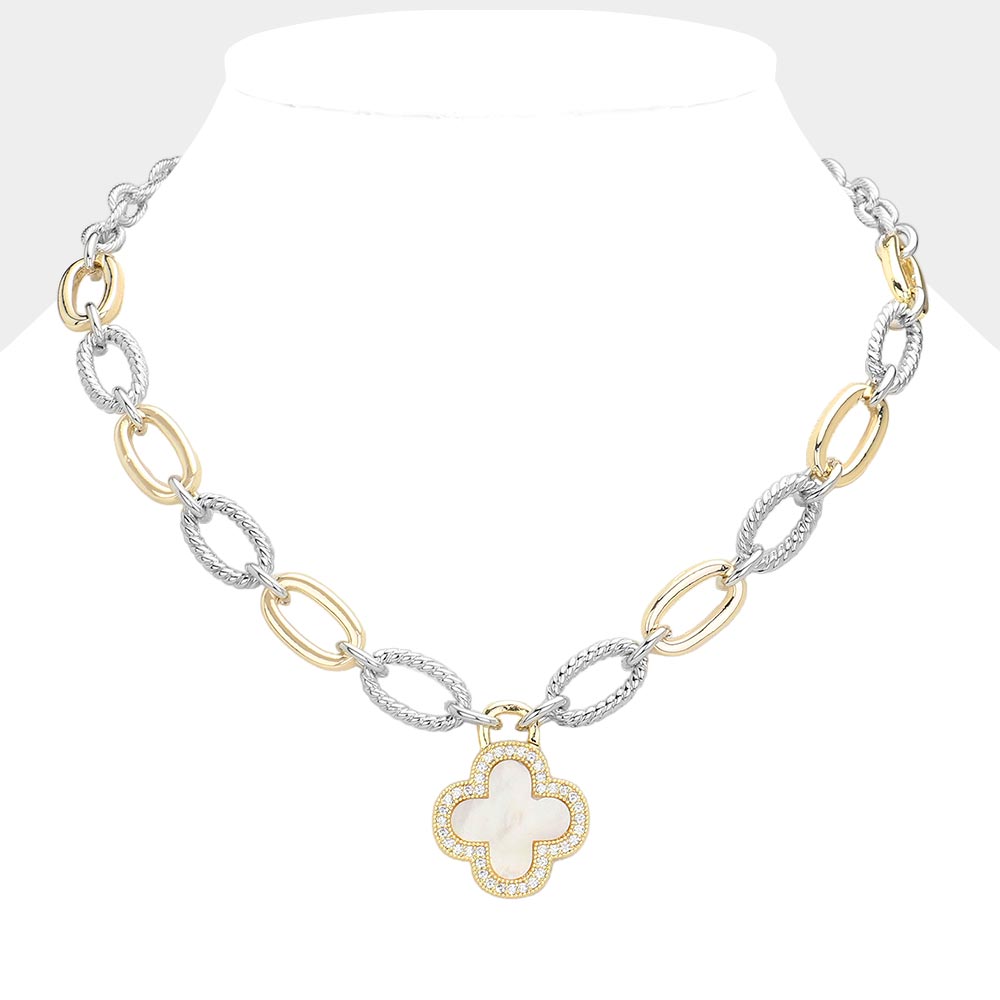 CZ Stone Paved Quatrefoil Pendant Two Tone Textured Metal Necklace