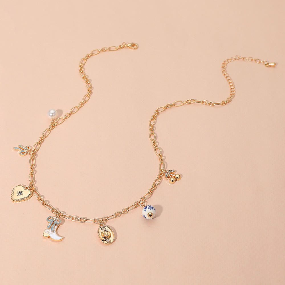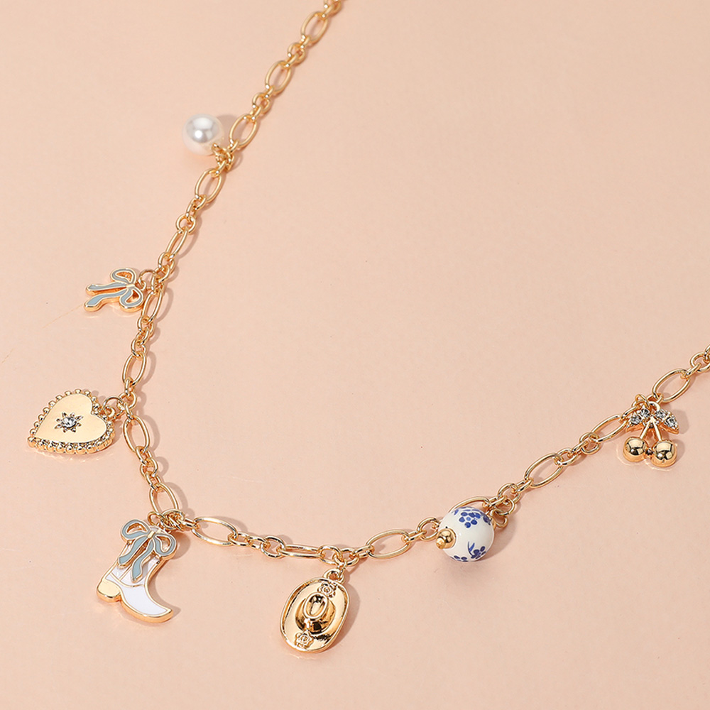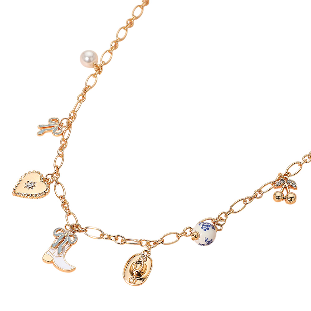 Enamel Bow Western Cowboy Boot Hat Heart Ceramic Ball Pearl Cherry Charm Station Necklace