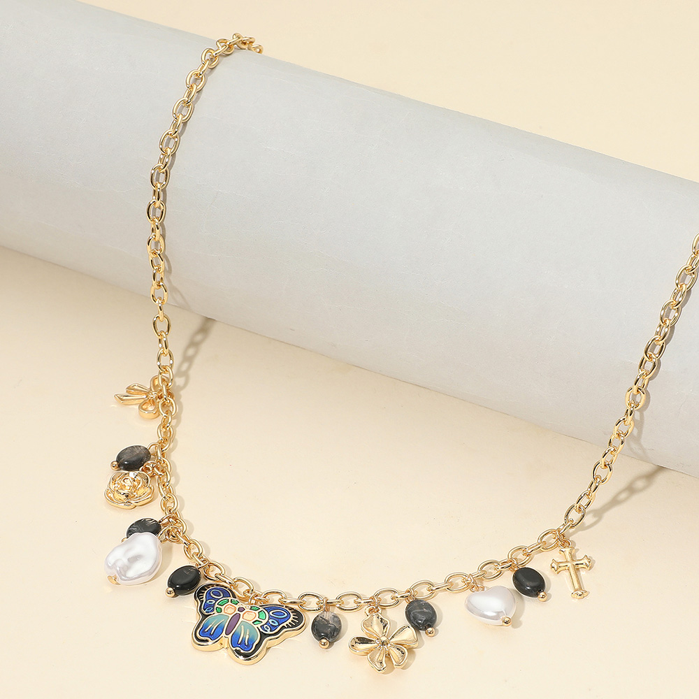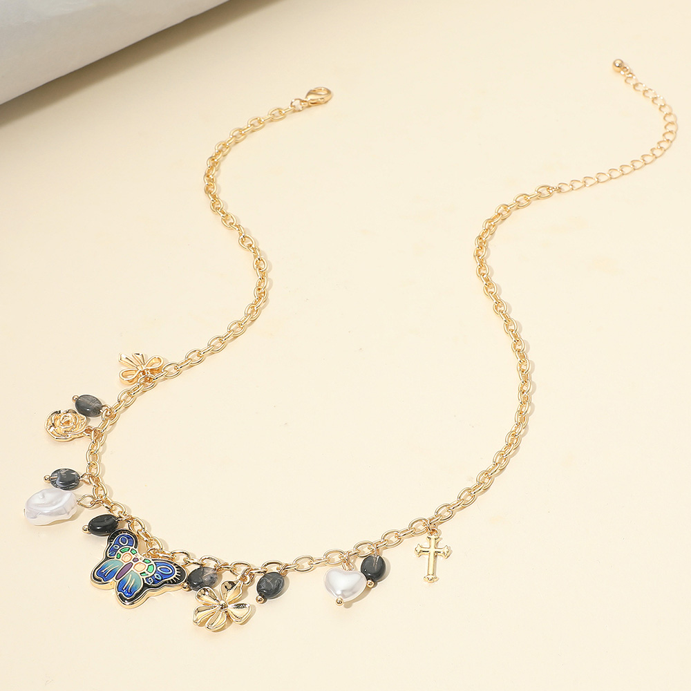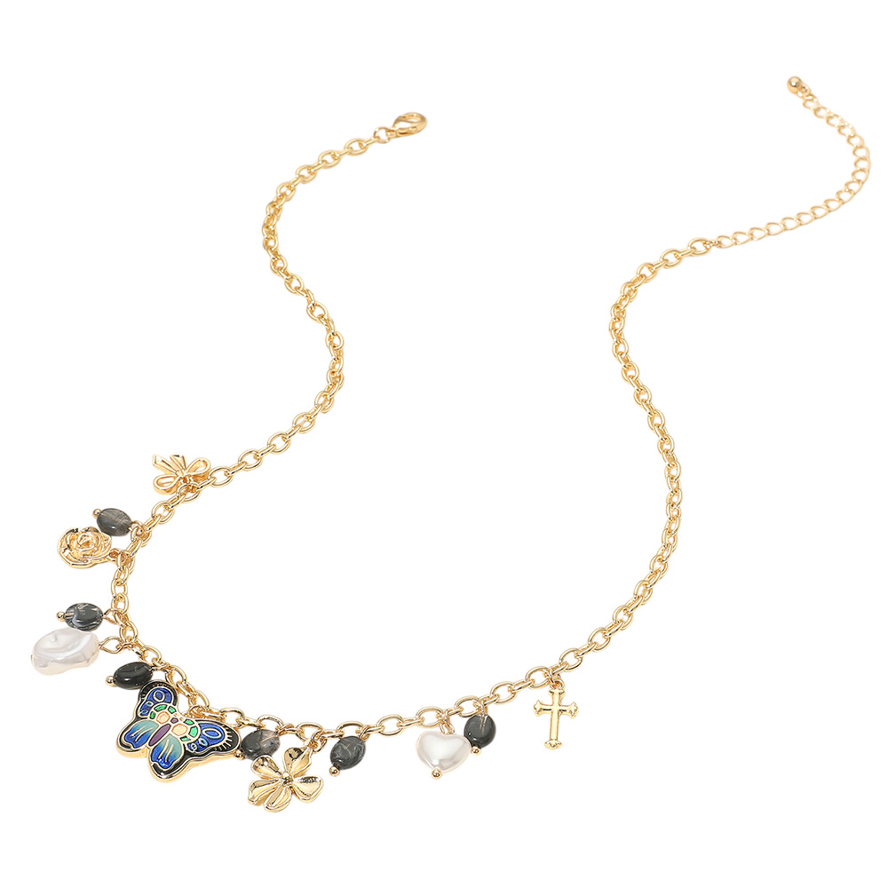 Details • Necklace Size : 17" + 3.25" L • Decor Size : 0.8" L • Add playful elegance to your collection with this butterfly charm necklace featuring a mix of symbolic pendants including hearts, flowers, a cross, and pearl accents. Perfect for layering or wearing solo, this unique piece brings color, meaning, and charm to any outfit. • Lead and Nickel Compliant