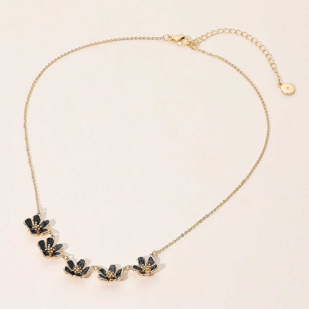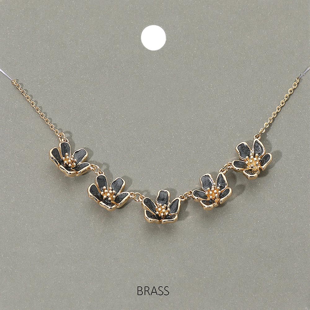 Details • Necklace Size : 16" + 3" L • Decor Size : 0.4" L • Elevate everyday style with the Floral Charm Station Necklace, featuring a series of delicate blossom accents set along a fine chain for graceful movement and subtle sparkle. Perfect for layering or wearing solo as a feminine statement piece. • Brass • Lead and Nickel Compliant