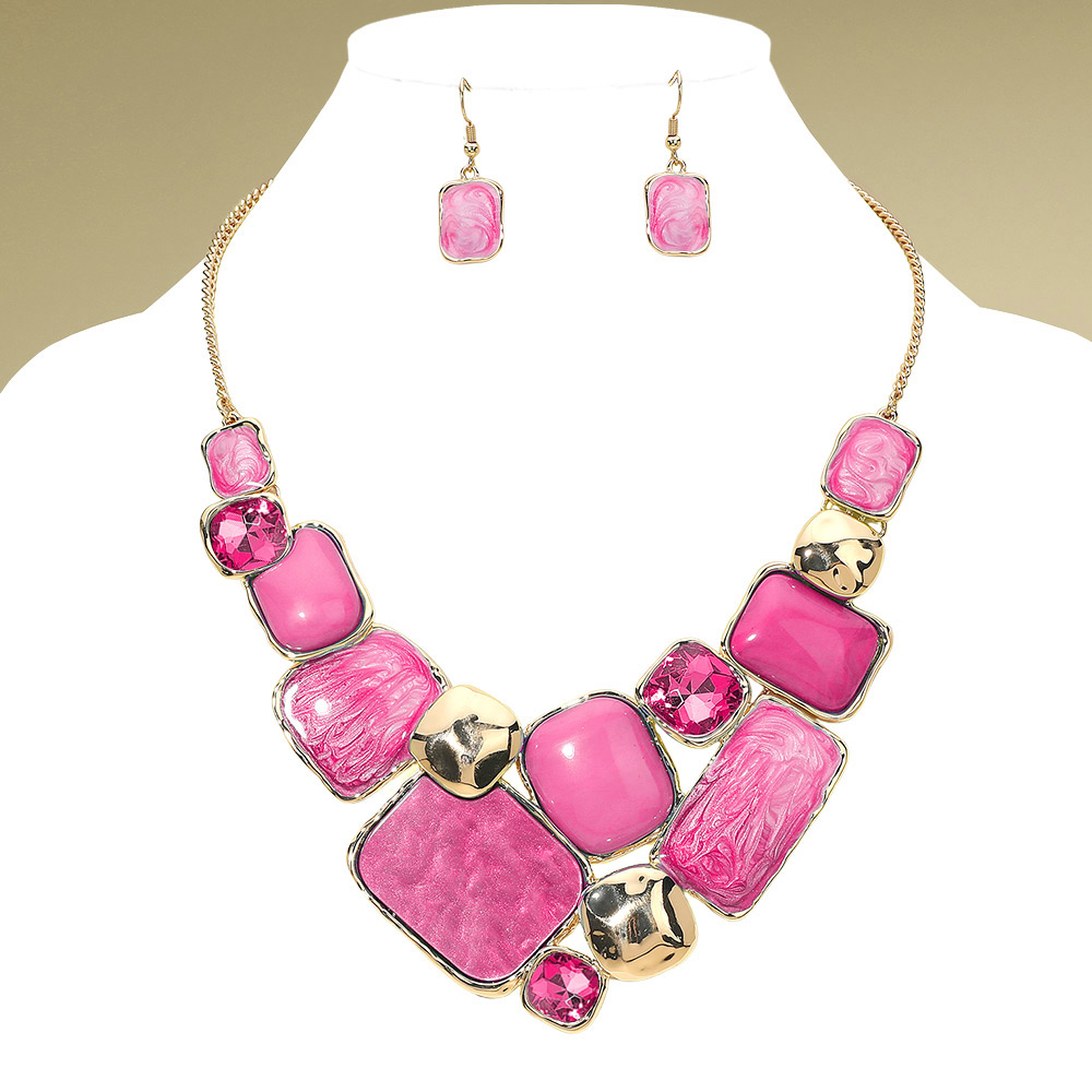 Details • Necklace Size : 18" + 3.5" L • Decor Size : 2.5" L • Earrings Size : 1.4" L • Modern statement necklace and earrings set featuring a mosaic of enamel geometric plate accents framed in metallic trim. The bold mix of smooth and marbled textures adds artistic flair, making it a standout accessory for elegant or contemporary fashion ensembles. • Lead and Nickel Compliant